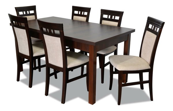 Jídelní set Elias působí na první pohled velmi honosně a elegantně. Bude vhodný zejména do jídelen zařízených v klasičtějším a rustikálním stylu. Jídelní stůl má ozdobně vyřezávaný okraj stolu a nohy. Set se skládá z rozkládacího jídelního stolu a šesti jídelních židlí. Pokud očekáváte početnější návštěvu, nemusíte se bát, že Vaše hosty nebudete mít kde usadit. Jídelní stůl se dá rozložit a vejde se při něm osm lidí. Jídelní židle mají čalouněné opěradla a sedací části. Opěradla židlí jsou ozdobně vyřezávané. Barevné provedení jídelního setu je ořech tmavý.