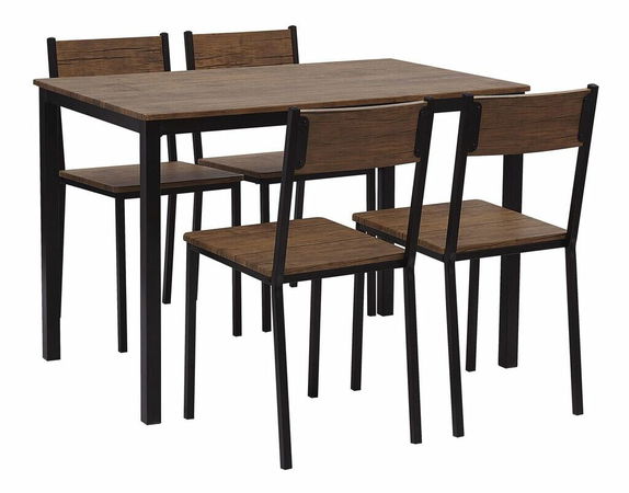 Tato 5dílná jídelní souprava v industriálním stylu se bude skvěle vyjímat v tradičním i moderním interiéru. Odolná stolová deska vyrobená z MDF materiálu dokonale ladí s černým ocelovým rámem s práškovou povrchovou úpravou. Pohodlné sezení zajišťují prostorná sedadla a široká opěradla židlí. Díky kompaktním rozměrům a možnosti zasunout židle pod desku stolu je skvělým řešením i do menších jídelen.