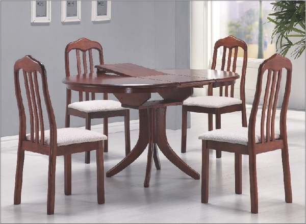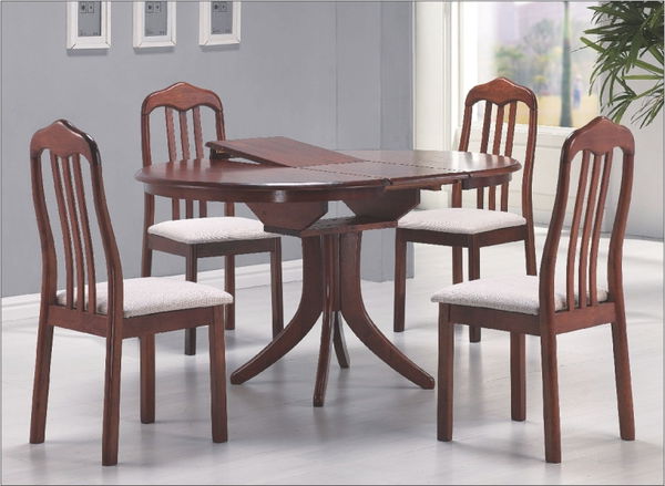 Dřevo z masivu v barvě antické třešně napovídá, že celý set působí velmi harmonicky a elegantně. Sedací část židle je z bledé látky. Netradiční design stolu doplňuje už jen to, že v případě potřeby se dá rozložit až skoro o 40 cm.