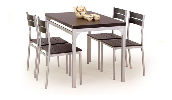 Jednoduchý, no moderní jídelní set se skládá ze stolu a čtyř židlí.