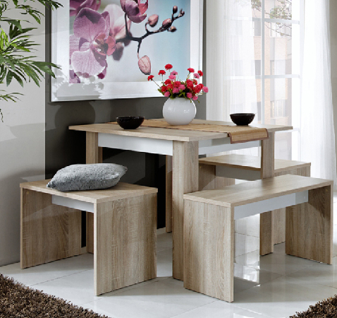 Elegantní jídelní set se stolem a třemi lavicemi. Vyroben je z laminované DTD v barevné kombinaci dřeva dub sonoma a bílé. Je vhodný na zařízení menších jídelen.