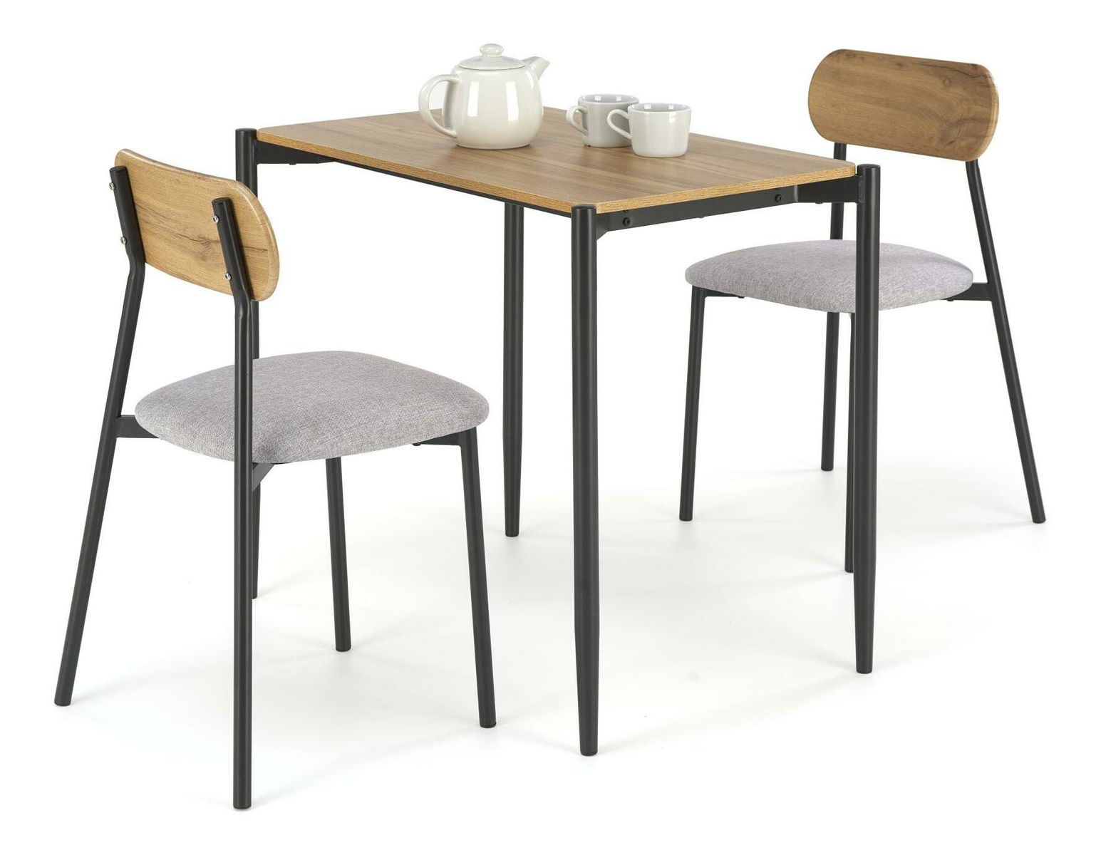 Minimalistický design tohoto setu s jemnou kombinací přírodního dřeva na prkně a černých nohou vytváří estetickou kompozici, která snadno zapadne do každého interiéru. Funkčnost této sestavy z ní činí ideální řešení jak do malých kuchyní, tak i do útulných jídelen. Židle Nandy s černým kovovým rámem zaručují stabilitu a odolnost. Opěradlo a sedátko s jemným šedým čalouněním jim dodávají jedinečný charakter a zároveň zajišťují pohodlí během dlouhých chvil strávených u stolu.