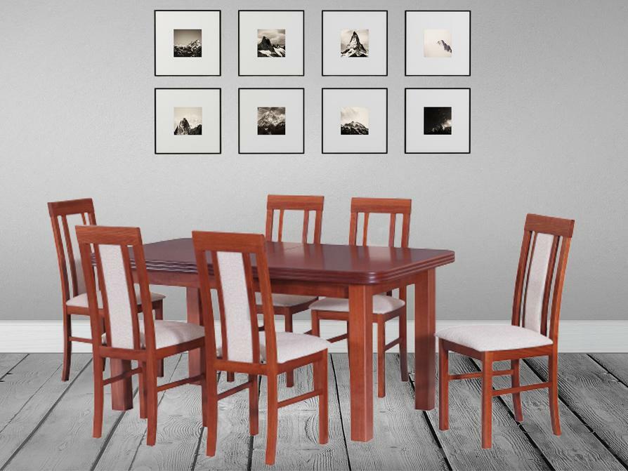 ZobrazitJídelní set Novis je ideální pro 6 až 8 osob. Set se skládá z rozkládacího stolu a šesti židlí a je vyroben v klasickém stylu s ozdobně vyřezávanými boky vrchní desky. Stůl má rozměry 76 x 160-200 x 90 cm a deska stolu je vyrobena z přírodní dýhy o tloušťce 48 mm. Každá židle má nosnost 120 kg a rozměry 96 x 43 x 40 cm o výšce sedu 48 cm. U stolu a židlí lze nakombinovat různá barevná moření. Při výběru jiného barevného provedení než je na obrázku, je požadována záloha 50% z ceny produktu s DPH předem.