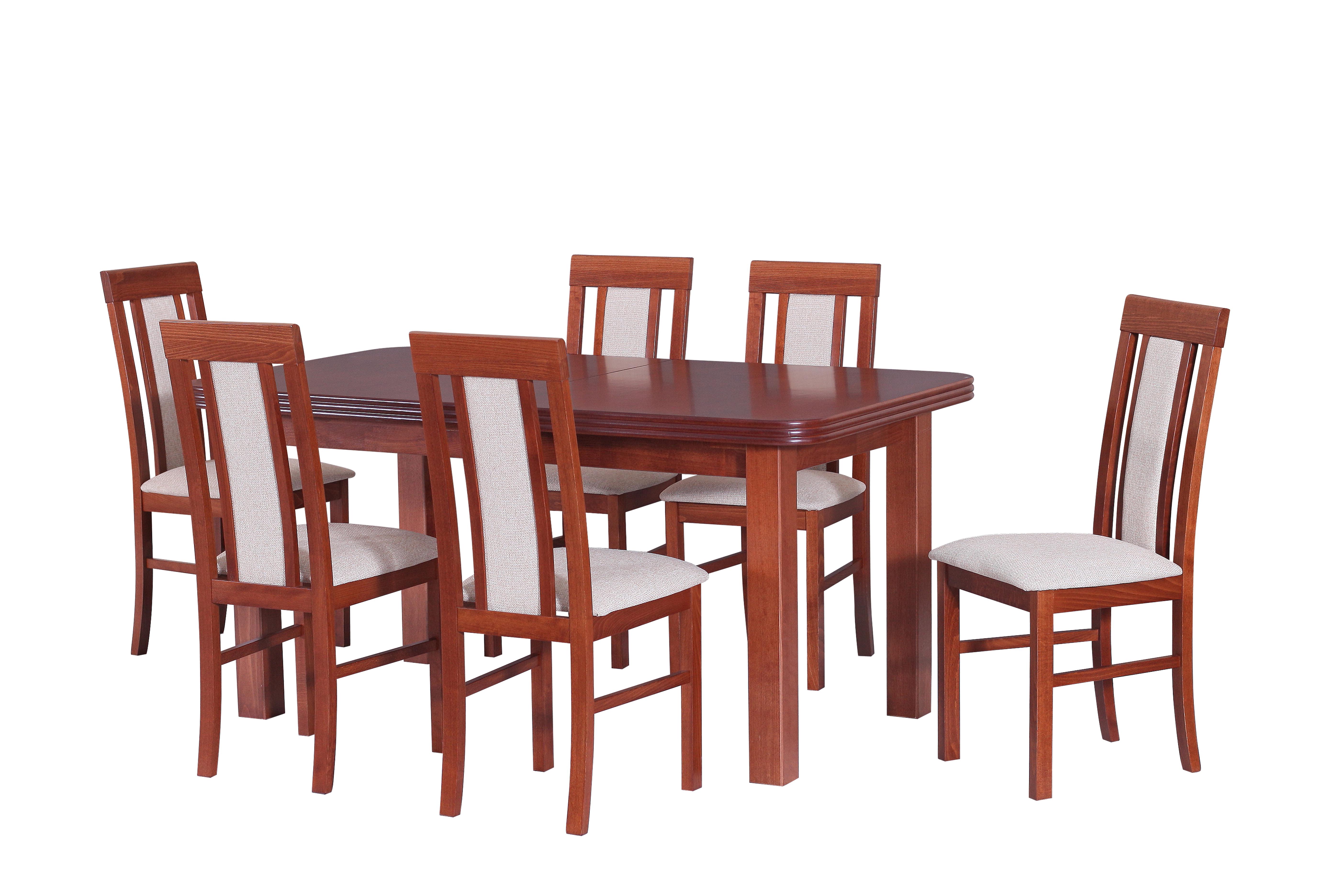Jídelní set Novis je ideální pro 6 až 8 osob. Set se skládá z rozkládacího stolu a šesti židlí a je vyroben v klasickém stylu s ozdobně vyřezávanými boky vrchní desky. Stůl má rozměry 76 x 160-200 x 90 cm a deska stolu je vyrobena z přírodní dýhy o tloušťce 48 mm. Každá židle má nosnost 120 kg a rozměry 96 x 43 x 40 cm o výšce sedu 48 cm. U stolu a židlí lze nakombinovat různá barevná moření. Při výběru jiného barevného provedení než je na obrázku, je požadována záloha 50% z ceny produktu s DPH předem.