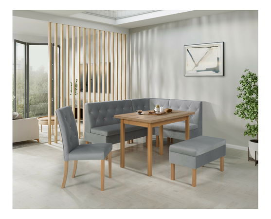 rohová lavice 130x170 cm, jídelní stůl 110x70x78 cm, židle 45x40x100 cm, lavička 80x40x48 cm