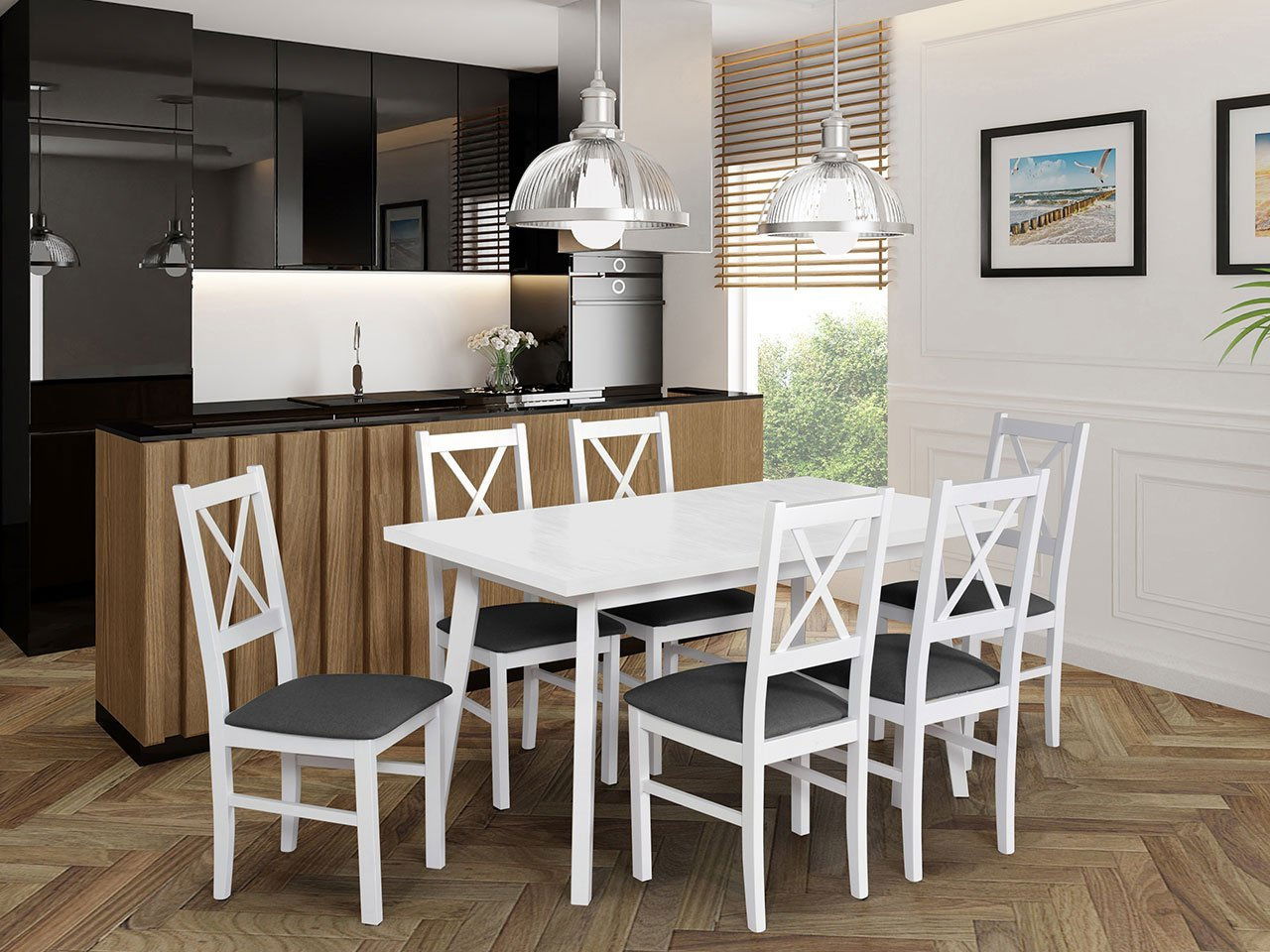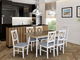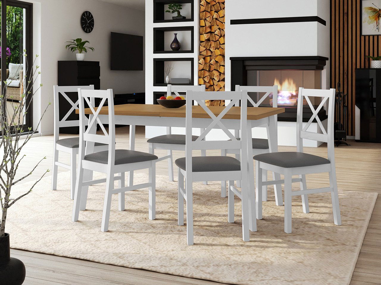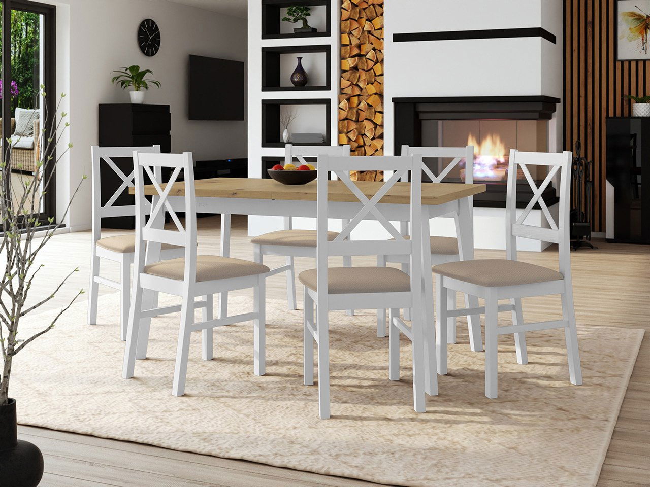ZobrazitStůl se 6 židlemi - je ideální volbou pro ty, kteří hledají pohodlí a styl. Praktická a módní sada AL11 stůl + 6 židlí poskytuje komfortní podmínky pro rodinné stolování. Do optimální velikosti stolu se vejde prostírání i talíře s jídlem. Dostatek prostoru je také pro vázu s květinami, dekorace a akcenty například na vánoční stůl. Stůl je roztahovací, díky čemuž je vhodný k pořádání oslav a setkání pro větší skupiny. Úspěšně zde protřeme stůl na narozeninovou kávu a pomocí stolu a židlí připravíme i vánoční večeři. Sedíc na pohodlných židlích Zefir X strávíme pěkné chvíle s našimi nejbližšími. Sestava obsahuje: 1x stůl Harry 80 x 140/180 V 6x židle Zefir X Rozměry stolu: délka: 140 cm délka v rozloženém stavu: 180 cm šířka: 80 cm výška: 75 cm Rozměry židle: šířka: 43 cm výška: 90 cm hloub: ilustračním obrázku stůl v barvách: dřevo: vrchní část - bílá, vnuk dub - barva na výběr výše nohy - bílé, židle v barvách: dřevo: bílé, látka: Jasmine 90 - látka podle výběru výše možnost doplnění a výběru jiné barevné varianty dřeva - v individuálních nabídkách dřevo deska stolu: laminát hrany ukončeno ABS dýhou horní tloušťka: 32 mm šikmé nohy 6,5 x 4,5 vzdálenost mezi nohama: dlouhý pás: 105 cm, krátký pás: 47 cm Provedení židle: bukové dřevo zakončené skvrnami a vodními lak