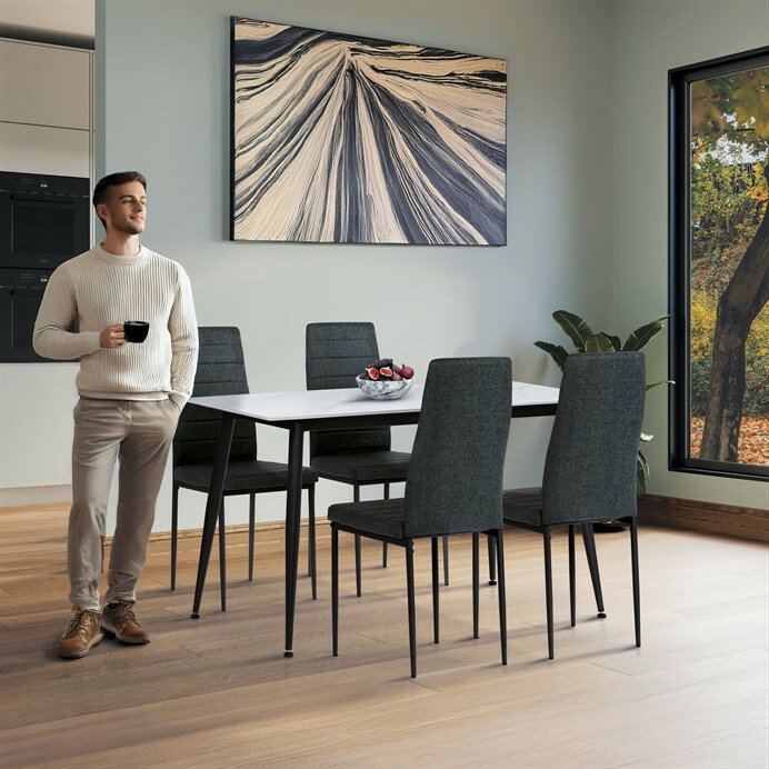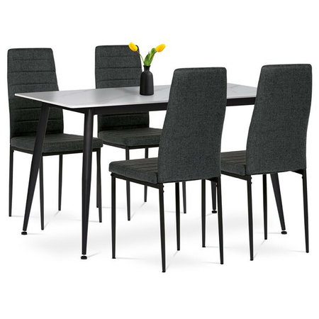 Moderní jídelní souprava Autronic v industriálním stylu je skvělou volbou pro vaši jídelnu. Obdélníkový stůl s deskou ze slinuté keramiky v bílém mramorovém dekoru působí elegantně a je odolný vůči poškrábání. Stabilitu zajišťují černé kovové nohy s jemně kónickým tvarem. Pohodlné židle mají čalounění z hladké černé látky a ergonomicky tvarovanou opěrku pro maximální komfort. Černé kovové nohy ladí se stolem a dodávají celku jednotný vzhled. Ideální volba pro stylové a funkční stolování.