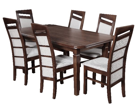 Pokud máte jídelnu zařízenou v klasickém stylu, jídelní set Vidar bude tím správným doplňkem. Set sestává z jídelního stolu a šesti židlí a už na první pohled zaujmou ozdobnými výřezy a designem. Jídelní set oceníte i během větších rodinných oslav. Stůl je možné rozložit a vejde se tak při něm až osm osob. Opěradla a sedadla židlí jsou čalouněné.