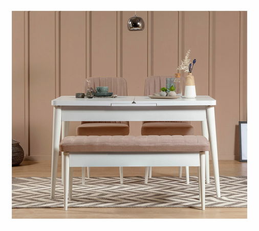 ZobrazitRozkládací jídelní stůl se 4 židlemi - Vlasta (Bílá + Šedá) je skvělým doplňkem pro vaši jídelnu. S výškou 77 cm, šířkou 130 cm a hloubkou 80 cm je dostatečně velký pro uspokojení vašich potřeb. Tento stůl je vyroben z kvalitních materiálů, které zaručují jeho trvanlivost a odolnost. Jeho moderní design v kombinaci bílé a šedé barvy přinese do vašeho interiéru eleganci a styl. Součástí tohoto setu jsou také 4 židle, které poskytnou pohodlí a pohodlné sezení. Rozkládací mechanismus stolu vám umožní zvětšit jeho plochu, když to bude zapotřebí. S tímto stolem a židlemi si užijete příjemné chvíle při jídle s rodinou a přáteli.