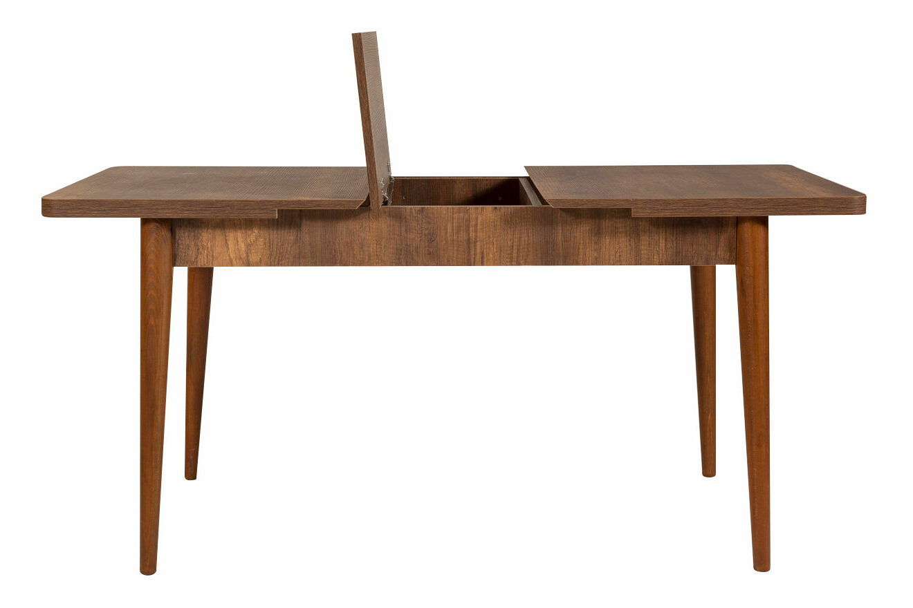ZobrazitRozkládací jídelní stůl se 4 židlemi Vlasta je ideálním doplňkem pro vaši jídelnu. S jeho výškou 77 cm, šířkou 130 cm a hloubkou 80 cm nabízí dostatečný prostor pro pohodlné pojídání a sezení. Jeho moderní design v kombinaci ořehového dřeva a šedé barvy přinese do vašeho interiéru elegantní a stylový vzhled. Tento jídelní stůl je také rozkládací, což znamená, že jej můžete snadno zvětšit, aby se pohodlně vešly všichni vaši hosté. Součástí tohoto produktu jsou také 4 pohodlné židle, které jsou perfektním doplňkem ke stolu. Vychutnejte si příjemné chvíle při jídle s tímto kvalitním a praktickým jídelním stolem a židlemi Vlasta.