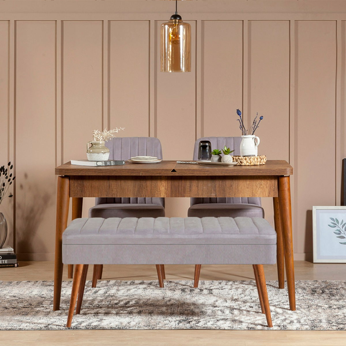 ZobrazitRozkládací jídelní stůl se 4 židlemi - Vlasta (Ořech + Šedá) je ideálním řešením pro vaši jídelnu či kuchyni. Tento stůl nabízí pohodlí a styl v jednom. S výškou 75 cm, šířkou 129 cm a hloubkou 80 cm poskytuje dostatek prostoru pro pohodlné usazení a příjemné stravování. Jeho rozkládací mechanismus umožňuje snadné a rychlé prodloužení stolu, abyste měli dostatek místa pro hosty. Stoly jsou vyrobeny z kvalitního materiálu v odstínech Ořech + Šedá, což jim dodává elegantní a moderní vzhled. Současně s tím jsou velmi pevné a odolné. Nechte se okouzlit jednoduchostí a praktičností tohoto rozkládacího jídelního stolu se 4 židlemi - Vlasta (Ořech + Šedá).