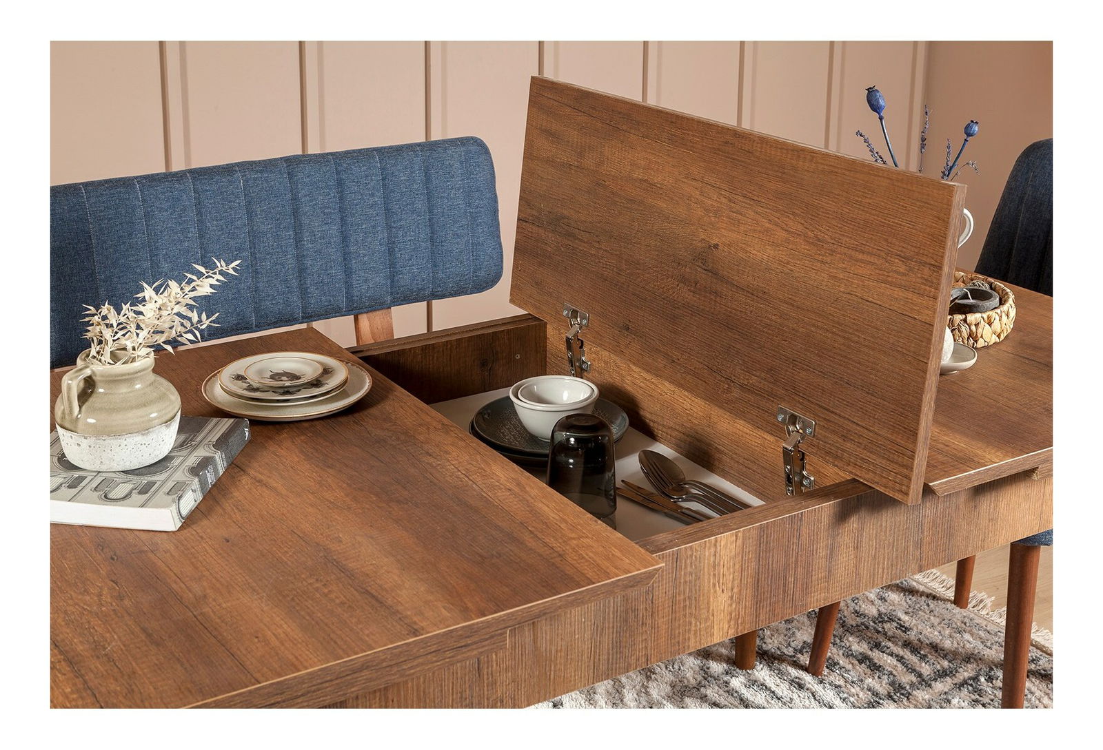 Jídelní set Vlasta 2 (ořech + tmavě modrá) (pro 6 osob)