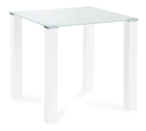 Stylový nerozkládací jídelní stůl čtvercového tvaru rozměrům pro 4 osoby s dřevěnými nohami v provedení bílá barva a skleněnou tvrzenou horní deskou v provedení bílém.