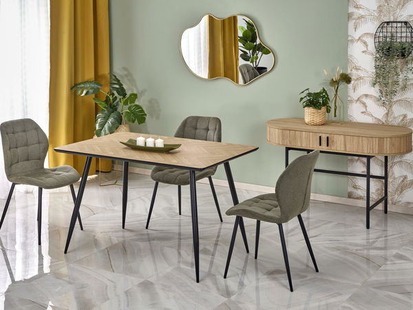 Stůl Bertrand není jen místem k jídlu či práci, ale také dokonalým způsobem, jak optimálně využít prostor. Díky kompaktním rozměrům jej snadno přizpůsobíte i malým místnostem, aniž byste obětovali pohodlí a funkčnost. Obdélníková deska z odolné MDF desky s přírodní dýhou dodává stolku Bertrand teplý a příjemný vzhled, který se snadno přizpůsobí různým stylům interiérového designu. Jde o minimalistické, ale elegantní řešení, které vytvoří příjemnou atmosféru ve vašem pokoji. Černé kovové nohy dodávají stolu nejen moderní charakter, ale zajišťují také stabilitu a pevnost konstrukce. Toto je praktické řešení pro lidi, kteří oceňují jednoduchost a odolnost nábytku.