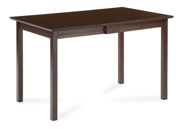 Rozkládací jídelní stůl pro 4 osoby. Masivní nohy, horní deska laminovaná DTD, moření do odstínu dřeva ořech.