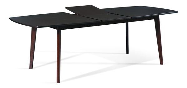 Jídelní stůl celodřevěný s jemnými nohama a rozkladem do velikosti pro 8 osob. Masivní dřevo, moření wenge.