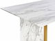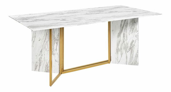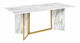 Vychutnejte si elegantní stolování díky tomuto nádhernému jídelnímu stolu, který poskytuje pohodlné sezení až pro 8 osob. Stolová deska z MDF materiálu, kterou zdobí podmanivý mramorový efekt, působí luxusně a navíc je zpevněna tvrzeným sklem pro větší odolnost. Mramorový vzhled stolu doplňují zlaté kovové nohy, které podtrhují jeho moderní design. Tento stůl je víc než jen kus nábytku – je vyjádřením vybíraného vkusu a okouzlující kombinací luxusu a moderního stylu. Proměňte svůj jídelní prostor na místo setkání a nezapomenutelných rozhovorů.