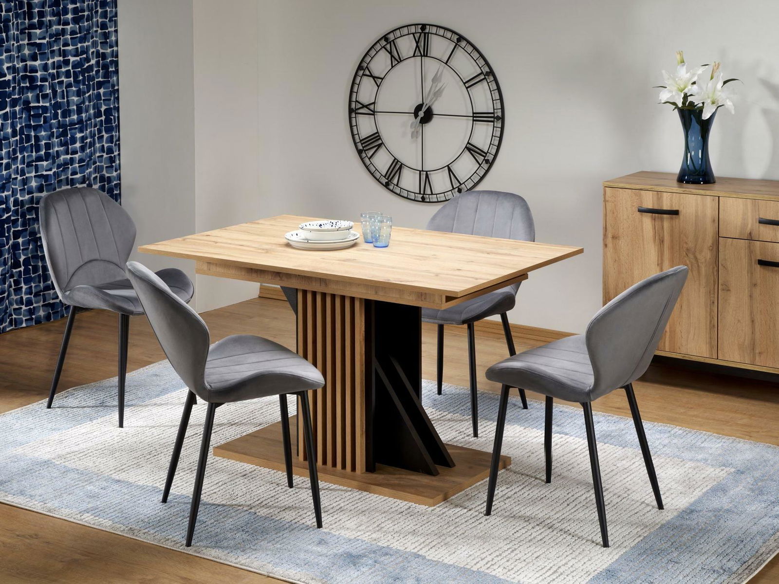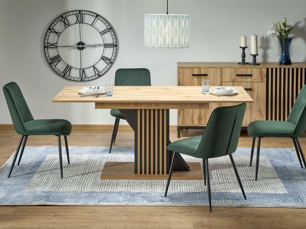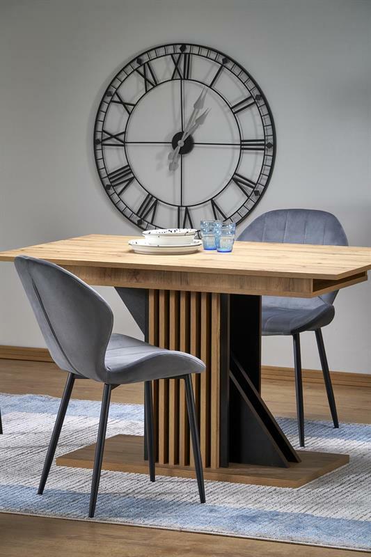 Stůl Fabio je nejen praktickým kusem nábytku, ale také elegantním doplňkem vašeho interiéru. Je vyroben z kvalitní laminované desky v provedení dub wotan a černá, což mu dodává moderní a stylový vzhled. Rozšiřitelná konstrukce stolu Fabio usnadňuje jeho přizpůsobení vašim potřebám bez ohledu na počet hostů. Funkčnost jde ruku v ruce s estetikou a jedinečný charakter mu dodávají ozdobné lamely na masivní noze. Není to jen místo k jídlu, ale také ústřední bod setkání a rozhovorů u vás doma.