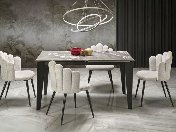Stůl Fenix je vynikající volbou pro ty, kteří oceňují moderní design a funkčnost v jednom. Jeho čtyři černé ocelové nohy mu dodávají mimořádnou stabilitu a eleganci a vytváří harmonickou kompozici se zbytkem interiéru. Sintrovaná deska v barvě vzorovaného šedého mramoru dodává stolu Fenix jedinečný charakter a dodává mu prestižní a luxusní vzhled. Díky možnosti rozložení stolu je jeho používání mimořádně praktické a přizpůsobuje se měnícím se potřebám a počtu hostů. Toto je ideální řešení pro ty, kteří jsou rádi připraveni na různé příležitosti, aniž by museli mít několik různých kusů nábytku.