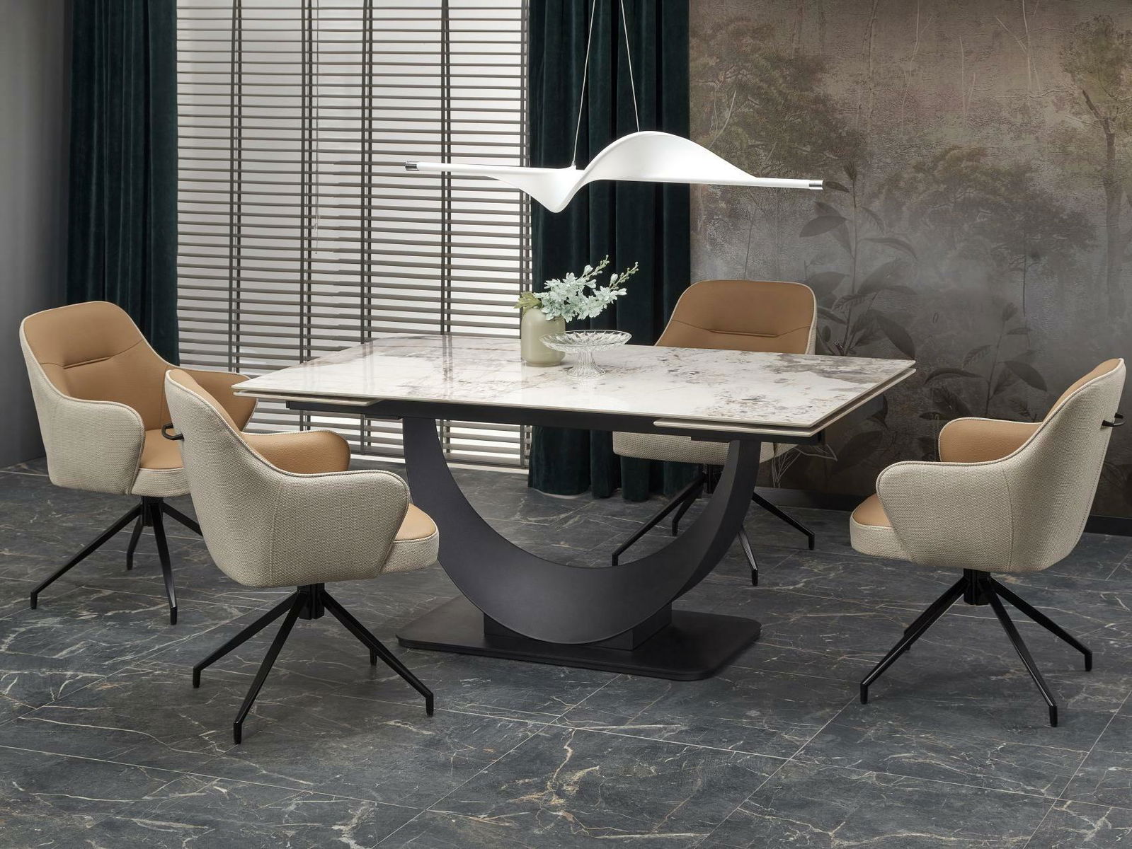 Jedinečnost stolu Fergie nespočívá jen v jeho estetice, ale také v praktičnosti. Díky sklopné desce stolu můžete jeho velikost přizpůsobit měnícím se potřebám a počtu hostů. Jedná se o dokonalé řešení pro ty, kteří oceňují funkčnost v kombinaci s moderním stylem. Černé ocelové nohy ve tvaru U jsou nejen stabilní konstrukcí, ale také poutavým prvkem, který dodává stolu Fernando charakteristický moderní vzhled. Kombinace bílého mramoru a hluboké černé činí z tohoto stolu nejen kus nábytku, ale skutečné umělecké dílo, které upoutá a dodá eleganci celému okolí.