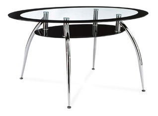 Moderní elegantní jídelní stůl, který zaujme svým designem a kombinací čirého a černého skla. Horní deska je v oválném tvaru a po obvodu je čiré sklo zdobené černým lemováním. Pod horní skleněnou deskou je polička s černým sklem. Nohy jsou v chromové barvě.