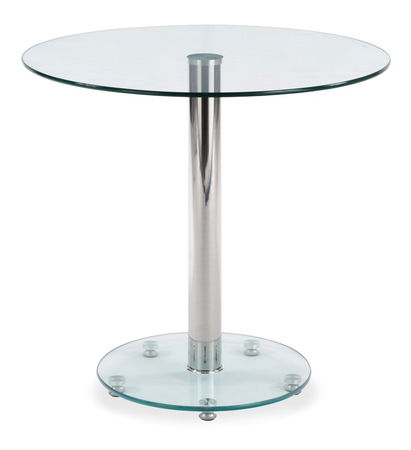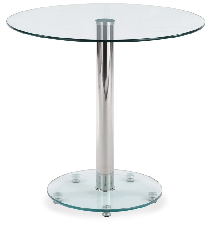 Jídelní stůl se skleněnou horní deskou o průměru 80 cm, kruhovou skleněnou základnou a pochromovanou nohou.
