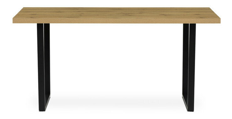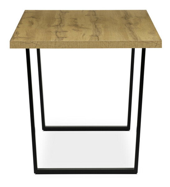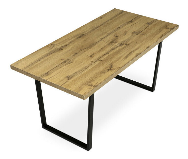 Jídelní stůl o rozměrech 160x80x76 cm kombinuje desku z hnědého lamina s dekorem dubu a stabilní kovovou podnož v černém matném provedení. Deska je opatřena ABS hranou, která chrání okraje před poškozením a usnadňuje údržbu, zatímco matný povrch zajišťuje příjemný vzhled bez lesku. Pevná kovová podnož poskytuje vysokou stabilitu a nosnost, což umožňuje pohodlné využití v jídelních prostorách. Materiál desky je navržen pro snadnou údržbu a odolnost vůči běžnému opotřebení, což přispívá k dlouhé životnosti stolu. Tento model je ideální volbou pro moderní interiéry, kde je kladen důraz na funkčnost a jednoduchý design.