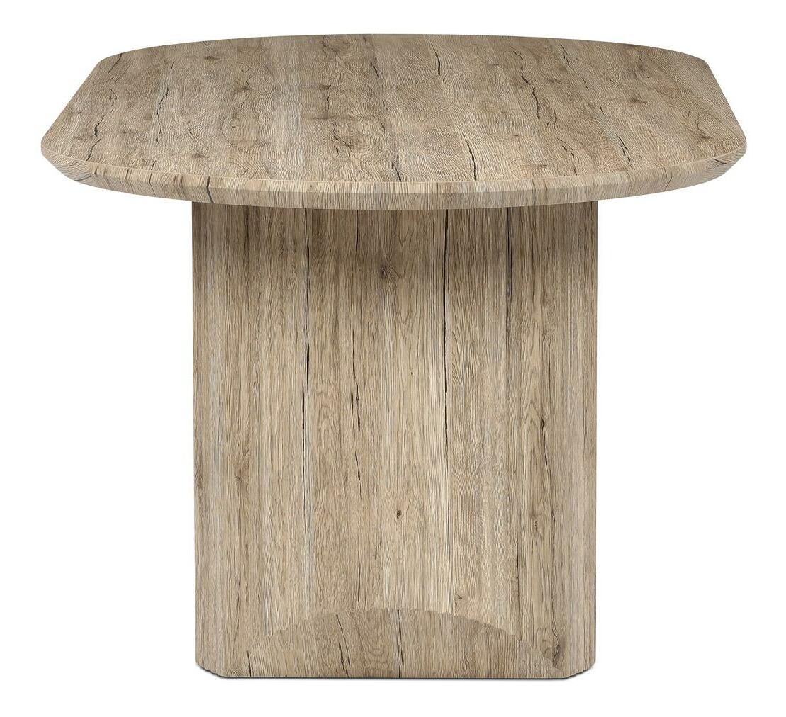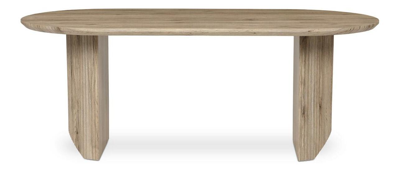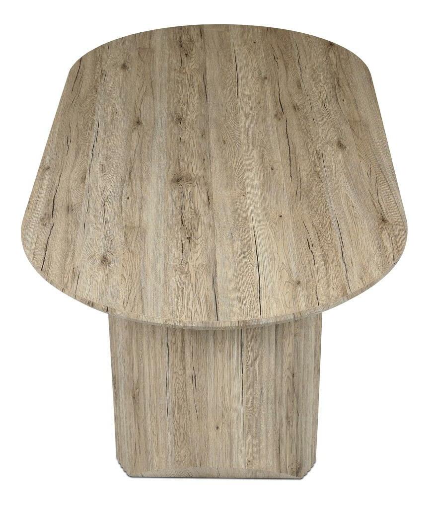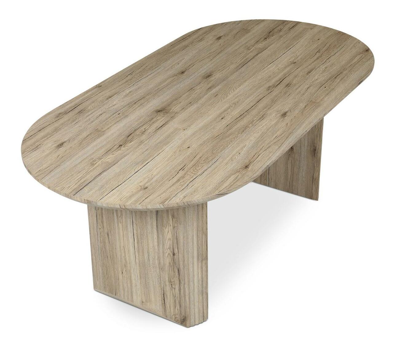 Jídelní stůl v přírodní dubové barvě vyniká moderním designem a kvalitním zpracováním. Oválná deska z MDF materiálu je odolná a snadno udržovatelná, což z něj činí ideální volbu pro rodinné večeře i slavnostní příležitosti. Detailně propracované nohy dodávají stolu stylový vzhled.