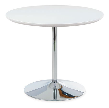 Kulatý jídelní stůl s horní dřevěnou deskou o průměru 90 cm v provedení vysoký lesk bílý. Noha a široká podnož stolu je chromová ve vysokém lesku.