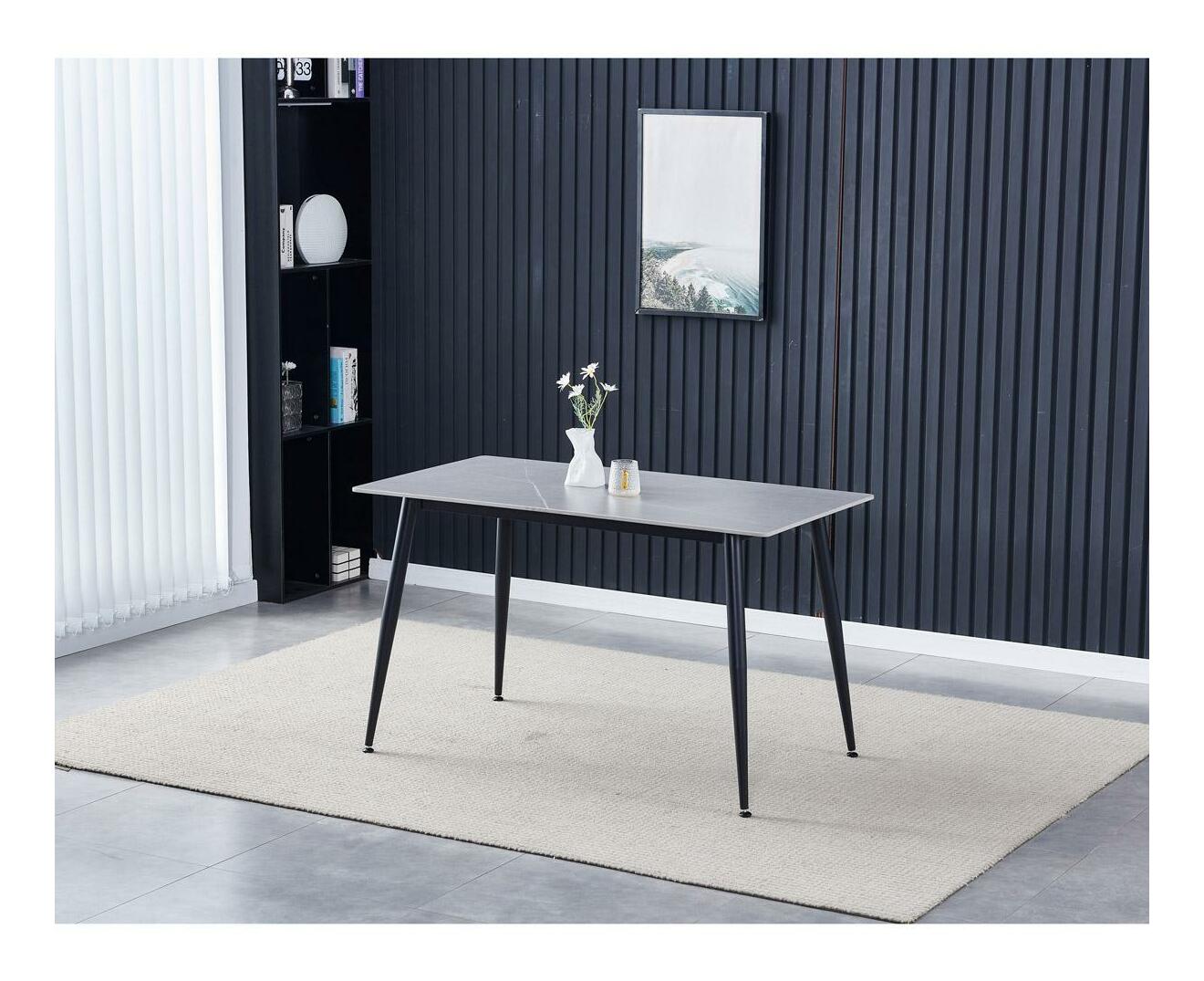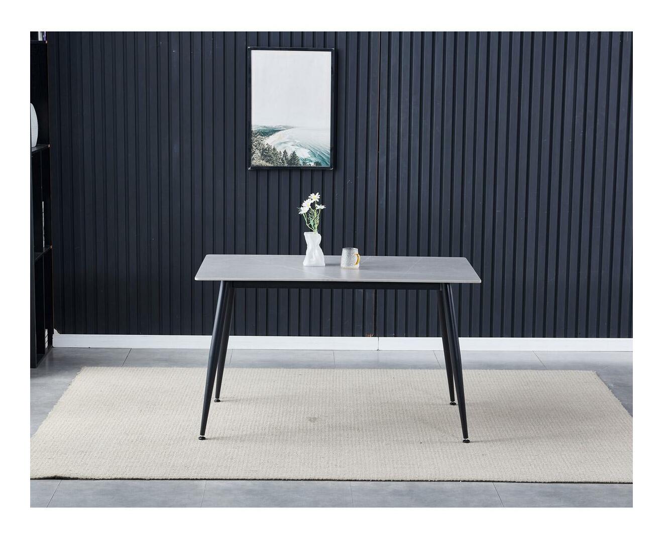Dopřejte si příjemné posezení u jídelního stolu s luxusním mramorovým dekorem, který jemně zdobí povrch a dodává mu nádech elegance. Šedivá deska ze slinuté keramiky s matnou povrchovou úpravou připomíná moderní industriální styl. Šedivý jídelní stůl se projevuje v kontrastu s černou kovovou podnoží, což zvyšuje estetický dojem jídelního prostoru. Mistrovské dílo v podobě stolu je vyrobeno ze slinuté keramiky, která se podobá špičkovému mramoru a zajišťuje vynikající odolnost a nenáročnou údržbu. Obdélníkový tvar desky umožní pohodlné stolování několika osob najednou. Elegantní jídelní stůl, který se vyznačuje obsahem elegance a modernosti, se hodí do kanceláře i domácnosti. Kombinace šedivé a černé barvy nabízí elegantní a zároveň odvážné vyjádření a vykreslí sofistikovaný obraz prostoru, ve kterém se nachází.