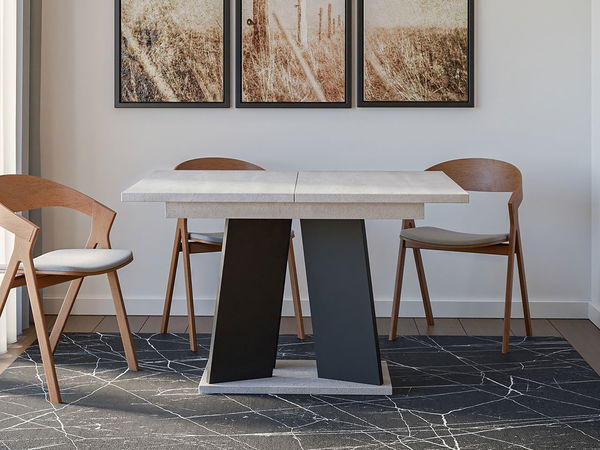 Jídelní stůl překvapí svým neobvyklým designem. Stolová deska osazená na originálním podstavci dodává modelu jedinečný charakter. Je ideální na rodinná setkání malých i větších skupin. Nespornou výhodou této varianty je, že se dá rozložit. Pod horní část byla umístěna další vložka. Neohlášení hosté vás nezastraší, protože jídelní stůl lze rozšířit až na 160 cm. Jeho solidní zpracování vám zaručí, že při něm strávíte mnoho příjemných chvil ve společnosti svých blízkých. Rozměry: délka: 120 cm, délka po vysunutí: 160 cm, šířka: 90 cm, výška: 75 cm.