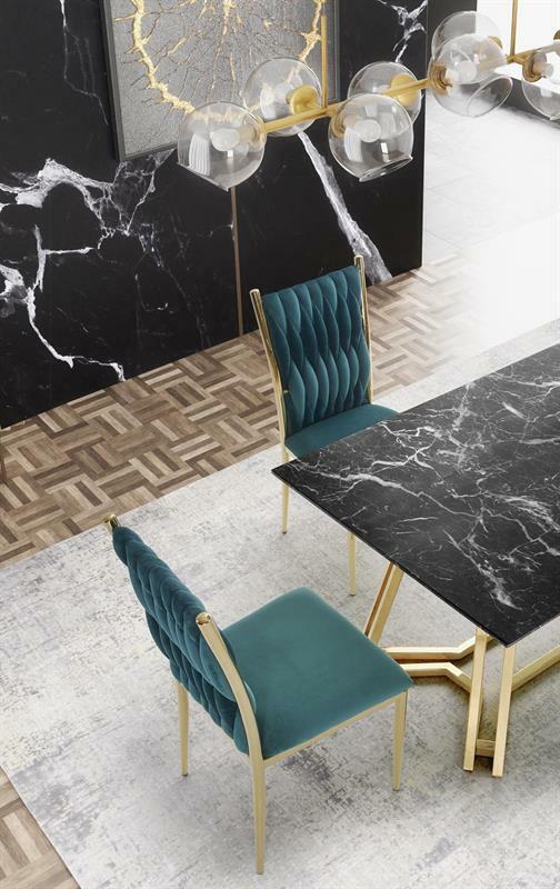 Jídelní stůl Kamoni je moderní a elegantní stůl pro 6 osob. Jeho kombinace černého mramoru a zlaté dodává tomuto stolu luxusní vzhled. S výškou 75 cm a hloubkou 90 cm je tento stůl ideální pro rodinné večeře nebo setkání s přáteli. Jeho povrch z mramoru je odolný a snadný na čištění. Kamoni stůl přidává kousek elegance a luxusu do každé jídelny.
