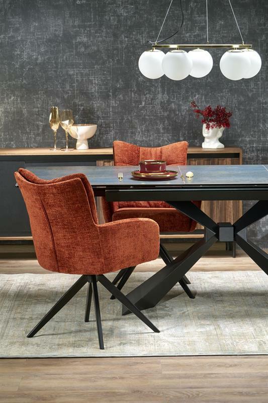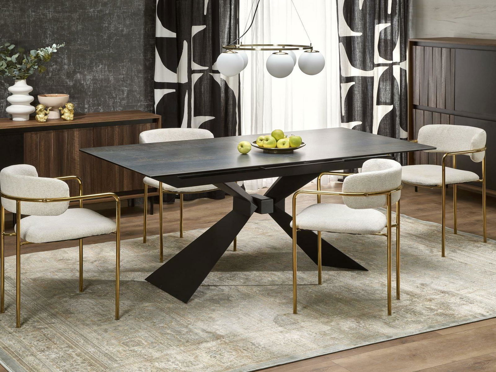 Stolová deska s mramorovým vzorem s namodralým nádechem je absolutním skvostem mezi nábytkem. Tento neobvyklý výběr materiálu – keramiky dává Luciusovi jedinečný charakter a zvláštní kouzlo. Každý pohled na tento stůl je cestou do světa estetiky, kde se elegance snoubí s funkčností. Skládací deska je praktickým řešením, které vám umožní přizpůsobit stůl měnícím se potřebám a počtu hostů. Vytvoříte tak ideální místo pro setkání, obědy či večírky a zároveň zachováte estetický vzhled stolu i se složenou deskou stolu.
