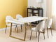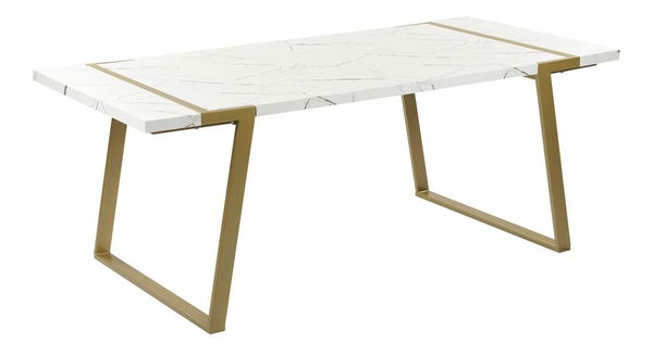 Sofistikovaný jídelní stůl se zlatýma nohama, který vnese do vašeho interiéru nádech luxusu. Stolová deska vyrobená z MDF vyniká bílým mramorovým efektem, který krásně zvýrazňují šikmé kovové nohy s povrchovou úpravou ve zlaté barvě. Dokonalá kombinace materiálů a barev zkrášlí každý prostor a díky designu stolu bude každé jídlo chutnat lépe. Tento stůl je ideální pro vytvoření stylového a luxusního zařízení interiéru.