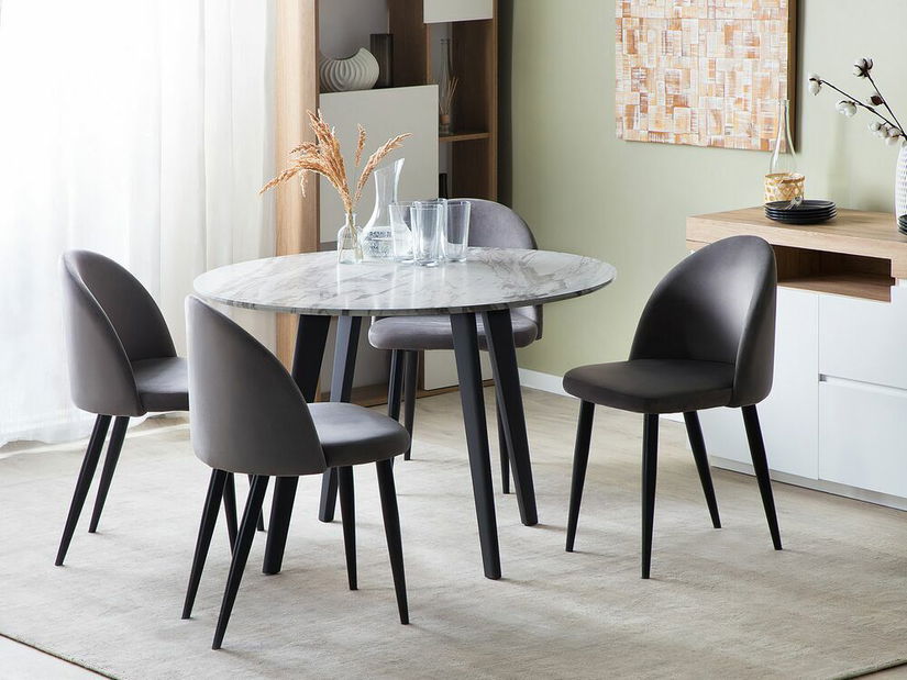 Užijte si nádherné momenty ve společnosti blízkých a přátel za tímto kulatým stolem s mramorovým efektem. Ať už plánujete rodinnou večeři nebo posezení s přáteli, tento stůl splní vaše požadavky. Krásné provedení stolové desky vyrobené z MDF materiálu známého svojí pevností a snadným nárokem na údržbu doplňují černé kovové nohy, které zaručují stabilitu stolu.