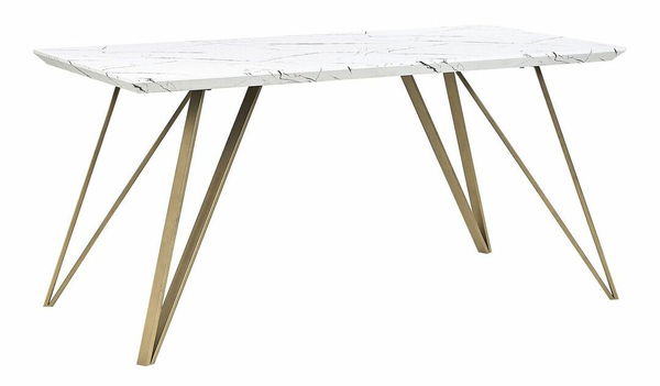 Hezký jídelní stůl je nezbytnou součástí každého domova. Odolná stolová deska vyrobená z MDF materiálu má okouzlující povrchovou úpravu s mramorovým efektem, díky které zkrášlí jakoukoli místnost. Masivní kovové nohy ve zlatém barevném provedení poskytují výjimečnou stabilitu a odolnost, která vydrží léta používání.