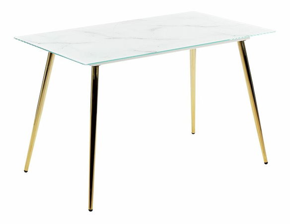 Díky stylovému stolu bude konzumace jakéhokoli jídla ještě příjemnější. Tento stůl se stane nejen pohodlným místo ke stolování, ale také poutavým středobodem místnosti. Je vyroben z velmi kvalitního tvrzeného skla a nerezavějící oceli. Nádherná bílá stolová deska s mramorovým vzhledem je doplněna lesklýma nohama zlaté barvy. Díky velikosti stolu jej lze umístit i do menších místností, kde nabídne pohodlné stolování až pro 4 osoby.