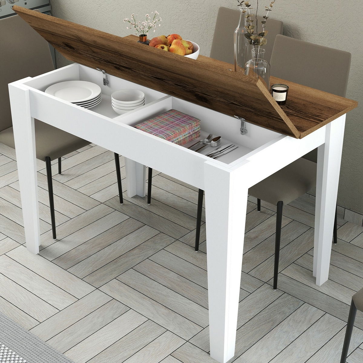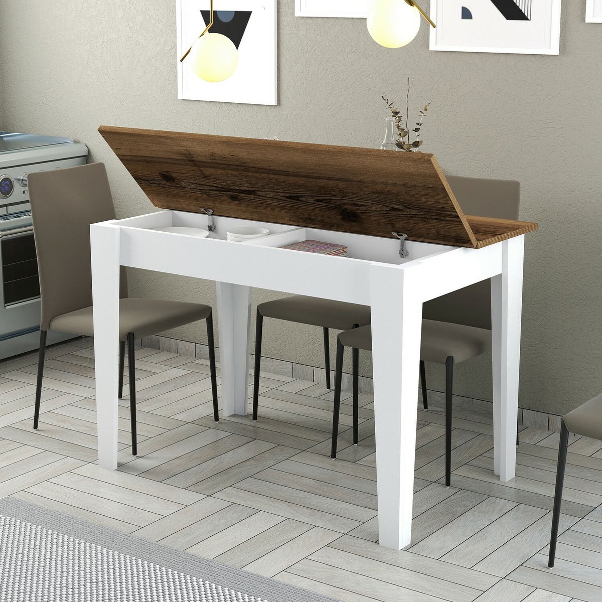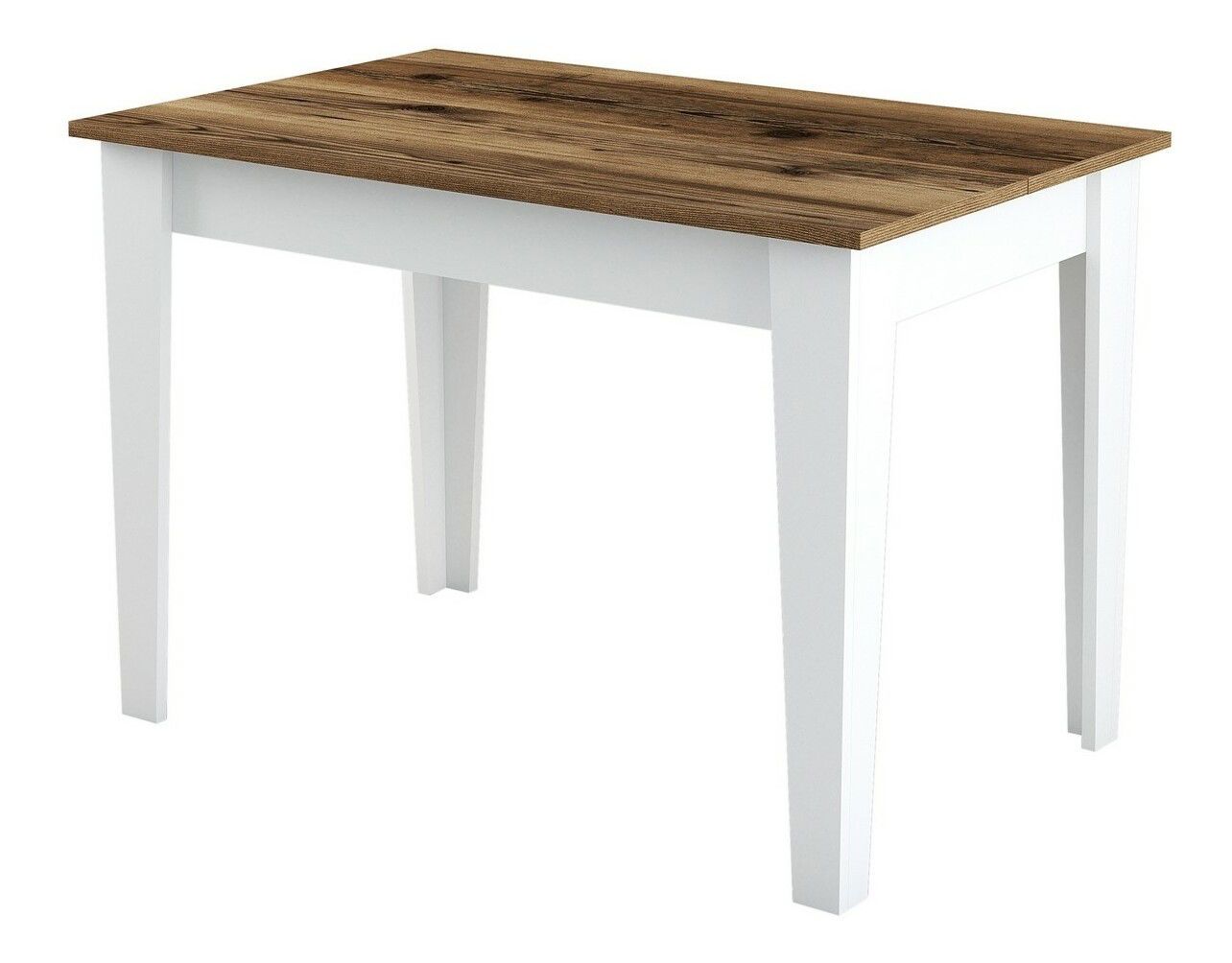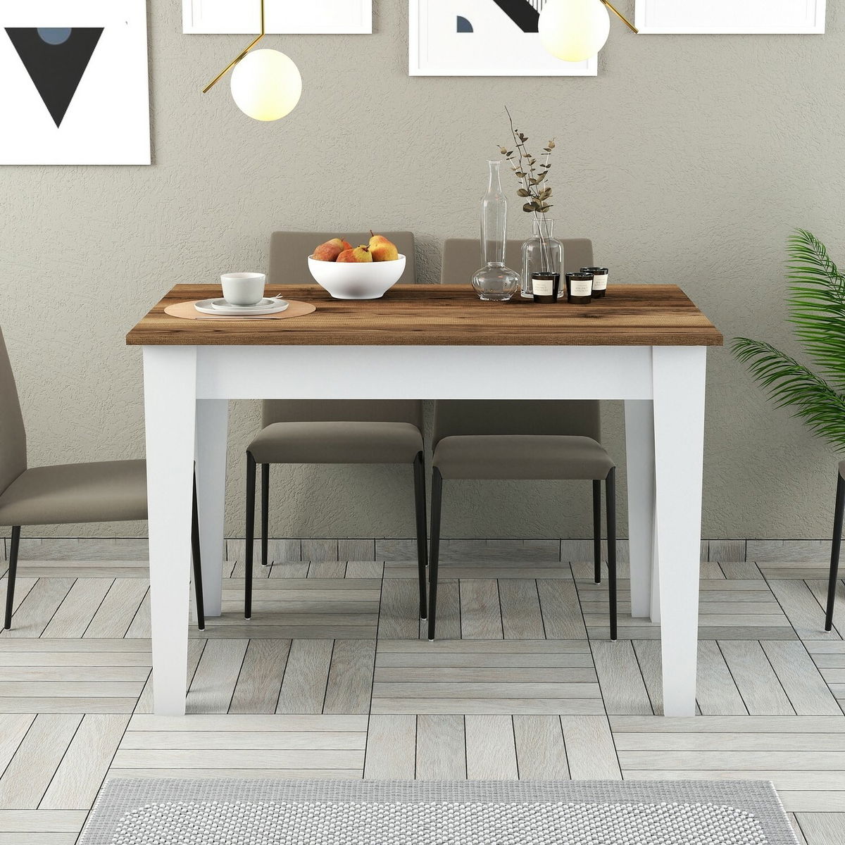 Jídelní stůl (pro 4 osoby) - Kika (Ořech + Bílá) je praktickým a elegantním kouskem nábytku pro vaši jídelnu. S výškou 75 cm, šířkou 110 cm a hloubkou 72 cm, tento stůl je ideální pro malé rodiny nebo pro prostory s omezeným místem. Jeho kombinace barev Ořech a Bílá dodává stolu stylový a moderní vzhled. Kvalitní zpracování a pevná konstrukce zaručují dlouhou životnost a spolehlivost. Jídelní stůl Kika je praktickým a atraktivním doplňkem pro váš domov, který poslouží nejen při rodinných večeřích, ale také při zábavách s přáteli.