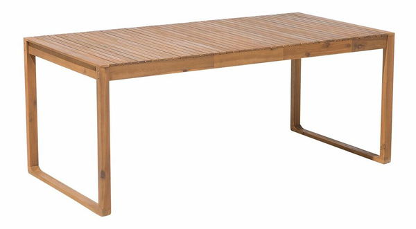 Zahradní jídelní stůl v minimalistickém stylu, ideální pro stolování na terase během slunečných letních dnů. Obdélníková konstrukce vyrobená z robustního akáciového dřeva nabízí pohodlný prostor až pro 6 osob. Jednoduchá stolová deska v odstínu světlého dřeva a zajímavě řešené nohy stolu podtrhují jeho moderní design.
