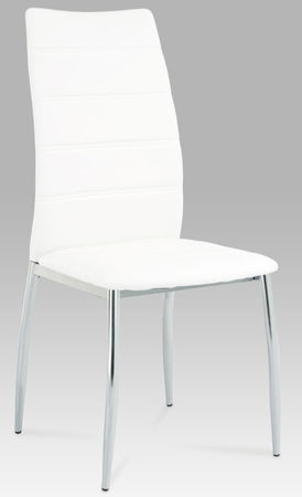 Elegantní jídelní židle se zajímavým vodorovným prošitím na opěrce na záda s kovovou konstrukcí v provedení chrom. Čalounění sedáku a opěráku je v kožence barvy bílá.