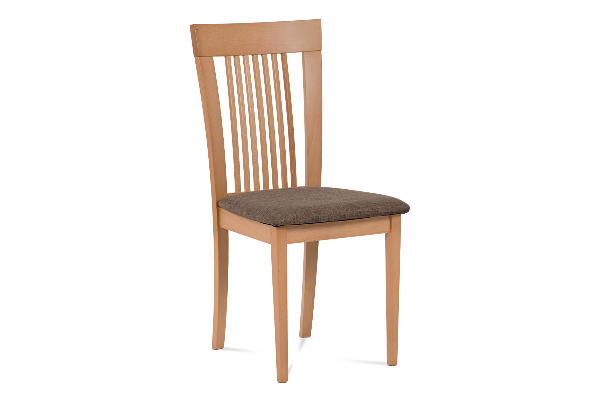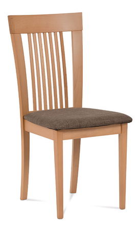 Dřevěná jídelní židle v provedení buk s čalouněným sedákem v hnědém odstínu.