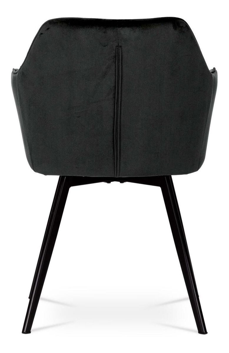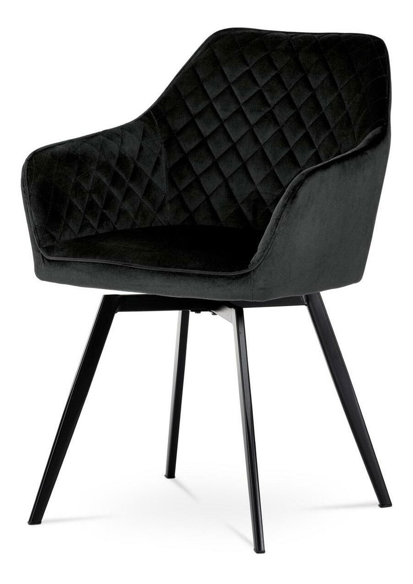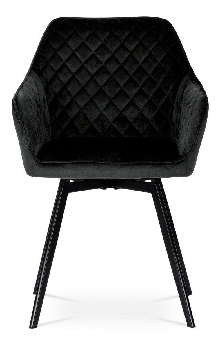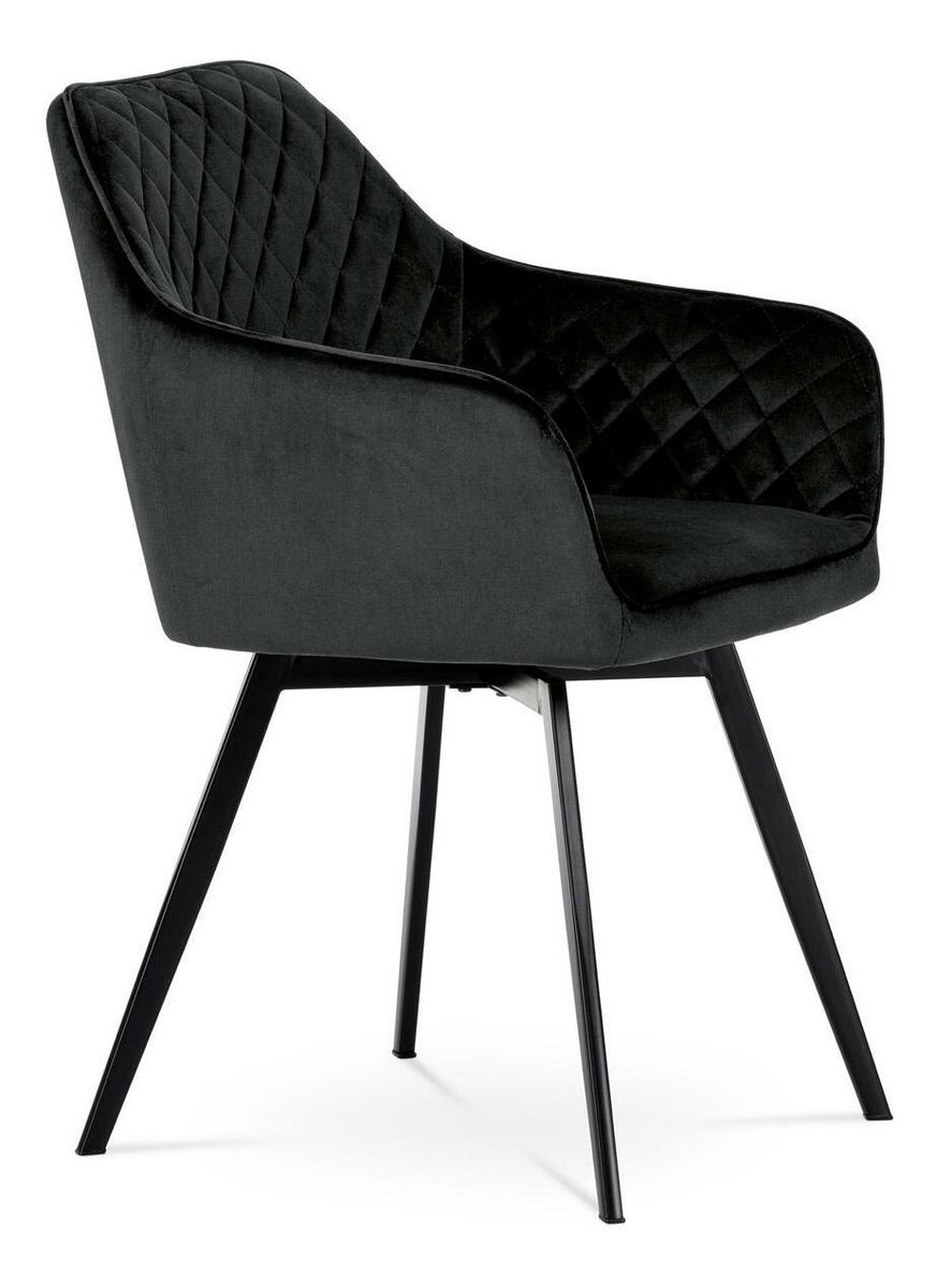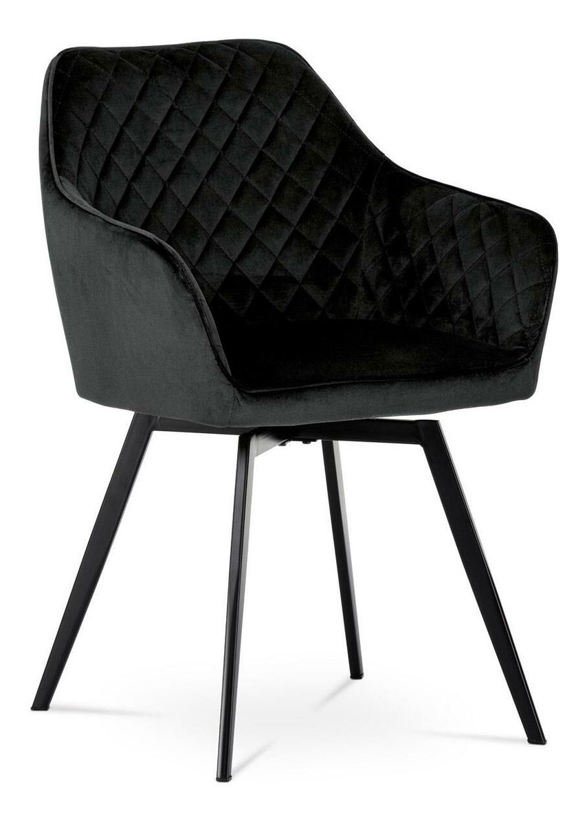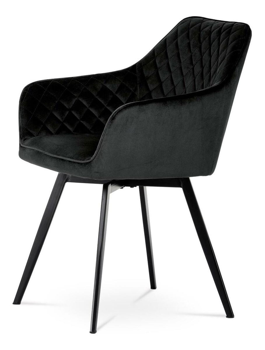 Díky svému dokonalému designu je tato židle v industriálním stylu nezaměnitelná a zároveň velmi pohodlná. Skořepina sedáku a opěradla má potah z kvalitní látky ve vesmírně černém matném sametu. Polstrování je z PU pěny. Velmi dekorativním prvkem je výrazné kosočtverečné prošití vnitřních ploch v barvě potahu a paspule po obvodu celé skořepiny. Vybraná látka se také velmi dobře čistí. Stabilitu židle zajišťují čtyři kónické kovové nohy obdélníkového průřezu s kvalitním práškovým nástřikem v černé matné barvě. Ukončeny jsou černými plastovými kluzáky, zabraňující poškození tvrdých povrchů podlah. Tato provedení produkují z tohoto modelu židle skvělou volbu pro zařízení obývacích či jídelních, ale také zasedacích místností. Nosnost židle je 110 kg. Bonusem této židle je otočný a vratný mechanismus, který umožňuje otáčení o 90° doleva ao 90° doprava a zároveň vždy vrátí sedák do původní polohy. Díky němu židle zůstanou vždy srovnány u stolu.
