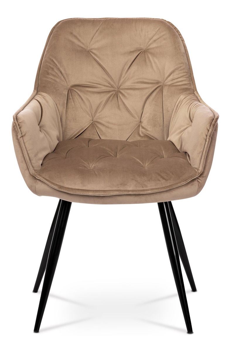 Díky svému dokonalému a industriálnímu designu je židle Dastra-421 nezaměnitelná a zároveň velmi pohodlná. Sedák a opěrák má potah z kvalitní sametové látky v trendy barevném provedení cappuccino. Polstrování je vyrobeno z PU pěny. Dekorativním prvkem je výrazné masivní čtvercové prošití sedacích částí v barvě potahu. Vybraná látka se také velmi dobře čistí. Stabilitu židle zajišťují čtyři kónické kovové nohy s kvalitním práškovým nástřikem v černé matné barvě. Ukončené jsou černými plastovými kluzáky, zabraňující poškození tvrdých povrchů podlah. Tato židle je skvělou volbu pro zařízení obývacích či jídelních, ale také zasedacích místností.