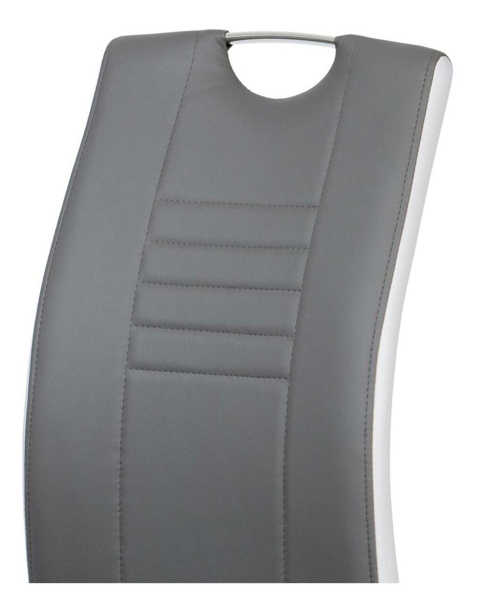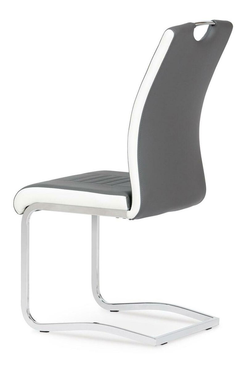 ZobrazitModerní jídelní židle na pohupné chromové podnoži, čalouněná koženkou v šedé barvě s bílými boky. Sedák s opěradlem jsou dekorativně prošity, chromové madlo zajistí snadnou manipulaci. Židle jsou velmi pohodlné a navíc stylové. Nosnost do 110 kg.