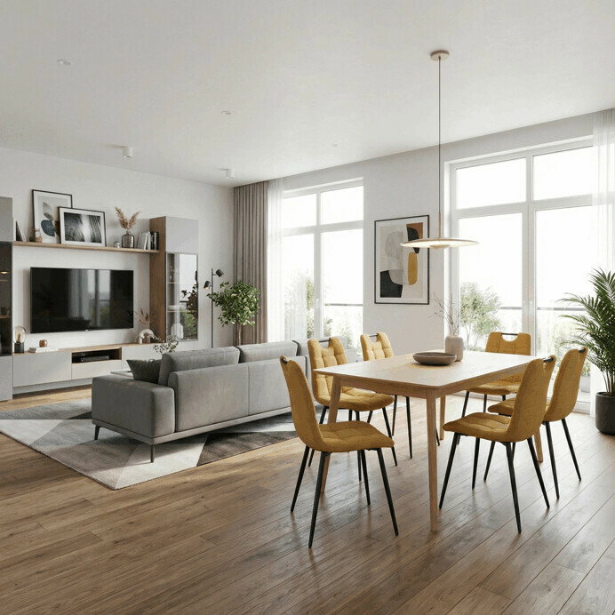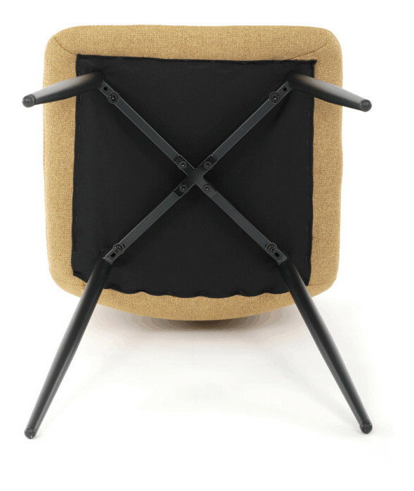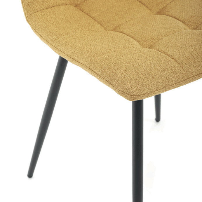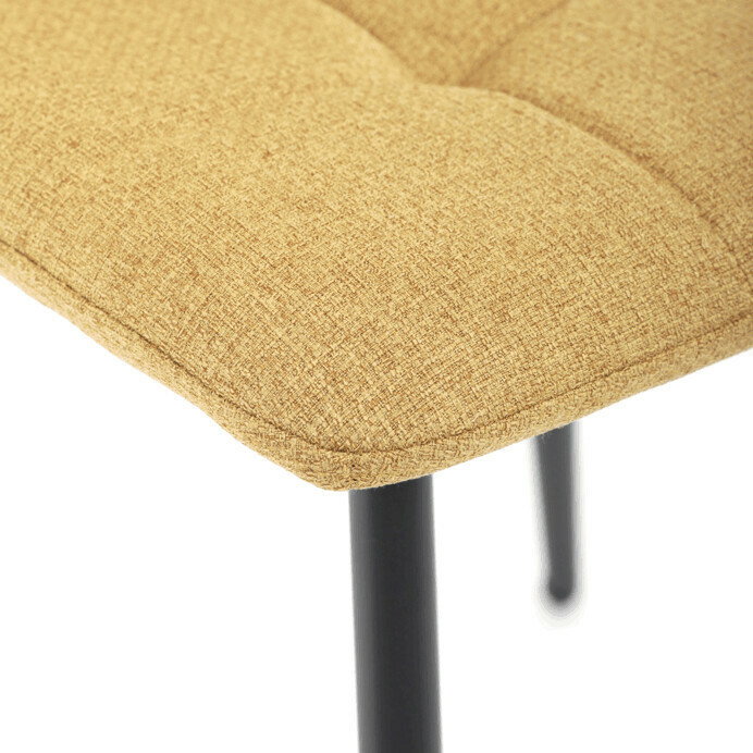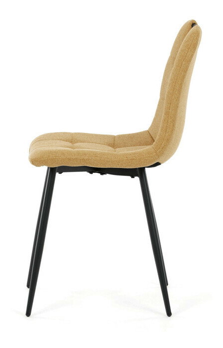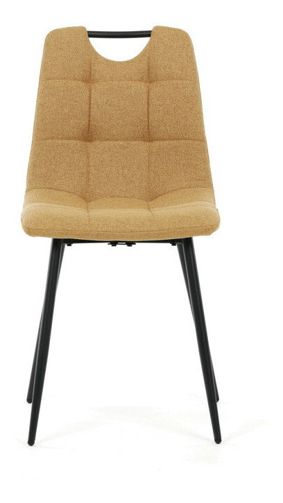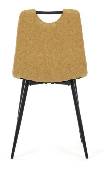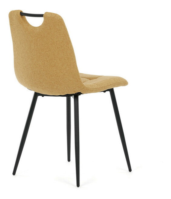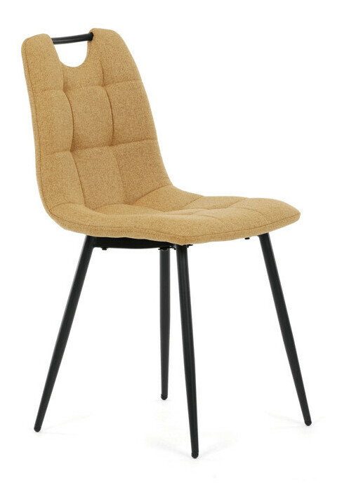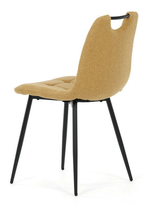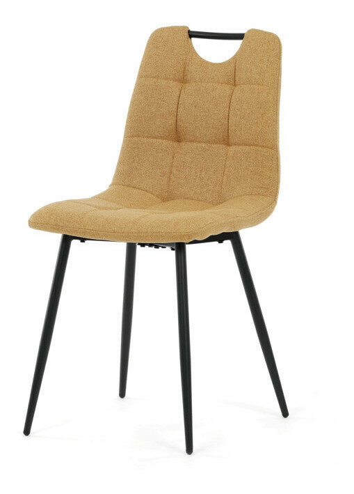 Jídelní židle s označením DCL-V2017 YEL2 kombinuje moderní design s praktickými vlastnostmi. Sedák a opěradlo jsou potaženy žlutou látkou, která se snadno udržuje a je doplněna designovým prošitím pro zvýraznění estetického dojmu. Černé matné kovové nohy zajišťují stabilitu a pevnost celé židle, zatímco integrované madlo v horní části opěradla usnadňuje manipulaci a přenášení. Židle nemá područky ani otočný mechanismus, což podporuje jednoduchost a kompaktnost. Díky kvalitnímu zpracování a použitým materiálům je vhodná pro každodenní použití v jídelnách i komerčních prostorách.