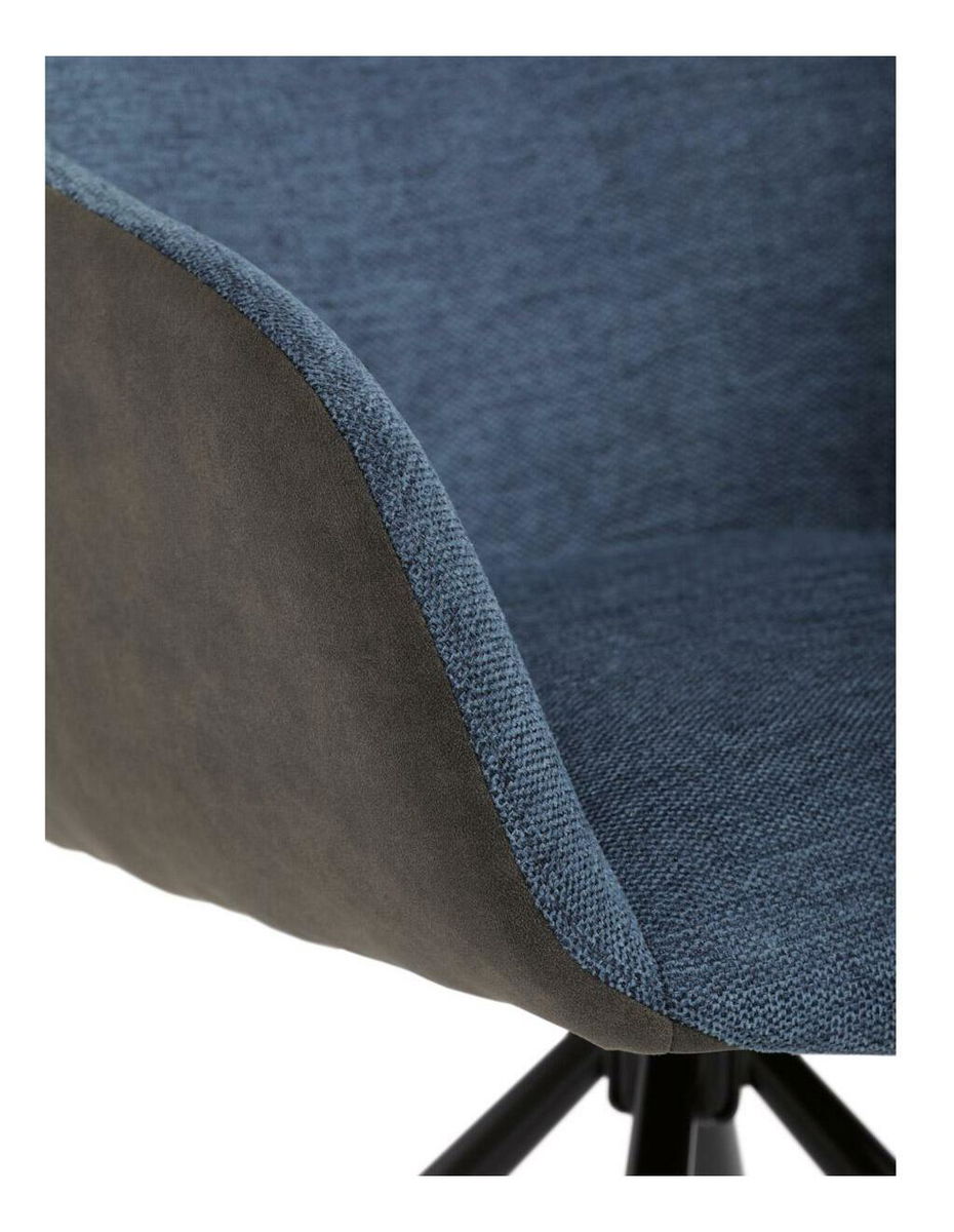 Modrá čalouněná židle vyniká kombinací barev a potahových materiálů na sedáku & opěradle a bocích. Židle dodává interiéru šmrnc a originalitu. Odolné látkové čalounění slibuje pohodlí a dlouhou životnost. Kovové nohy zajišťují stabilitu a moderní vzhled. Díky otočné funkci L90°/P90° s vratným mechanismem snadno přizpůsobíte směr sezení svým potřebám. Područky poskytují extra komfort při delším sezení, ideální pro pracovny nebo obývací pokoje.