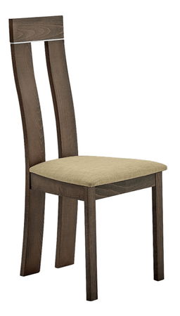 Stylová vysoká designová jídelní židle s širokými zadníma nohama, které pokračují do opěradla. Opěradlo je zdobené příčnou tenkou šedou linkou, sedák židle je z látky v hnědé barvě. Barevné provedení je buk merlot a židle je vyrobena z masivu buk. Výška sezení je 48 cm.