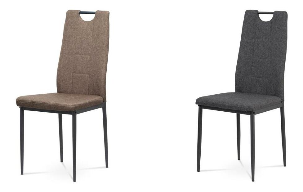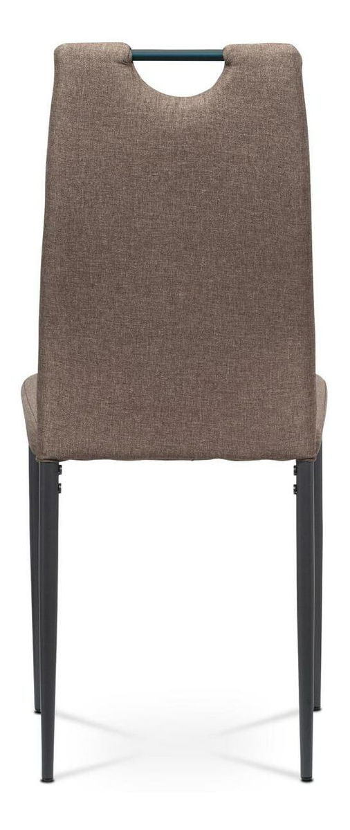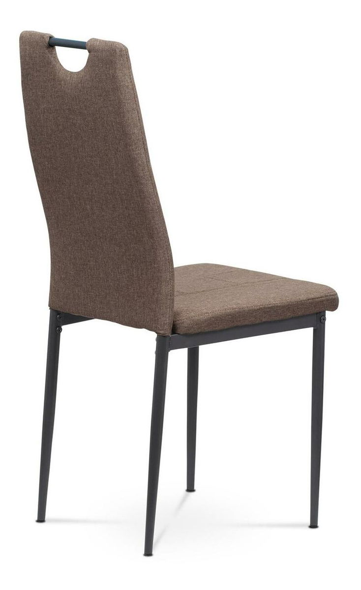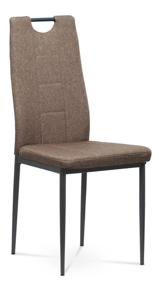 ZobrazitModerní jídelní židle s jednoduchým designem je čalouněna příjemnou hnědou látkou s prošitím sedáku i opěradla. Kovová podnož je lakována matnou antracitovou barvou a její součástí jsou také černé plastové kluzáky, které snižují riziko poškození podlahy. Pro snazší manipulaci je židle vybavena kovovým madlem, které je lakováno matnou antracitovou barvou. Nosnost židle je maximálně 110 kg.