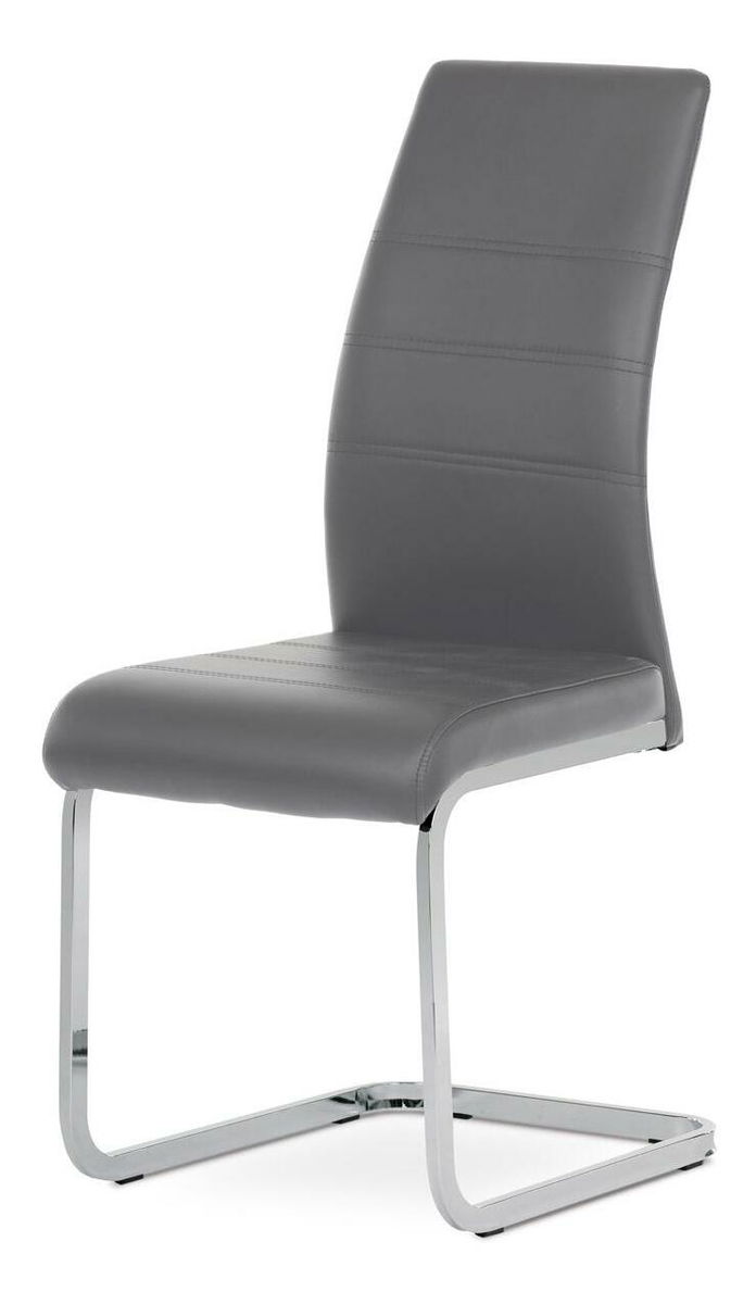Moderní jídelní židle zaujme svým elegantním designem, který je ideální pro stylové interiéry. Potah z šedé ekokůže v kombinaci s chromovanou kovovou podnoží ve tvaru pohoupající konstrukce přináší nejen atraktivní vzhled, ale také vysoký komfort sezení. Pohodlné polstrování z PU pěny zajišťuje měkký posez a dlouhou životnost. Židle je snadno udržovatelná díky odolnému materiálu a hodí se jak do moderní jídelny, tak i do komerčních prostor.