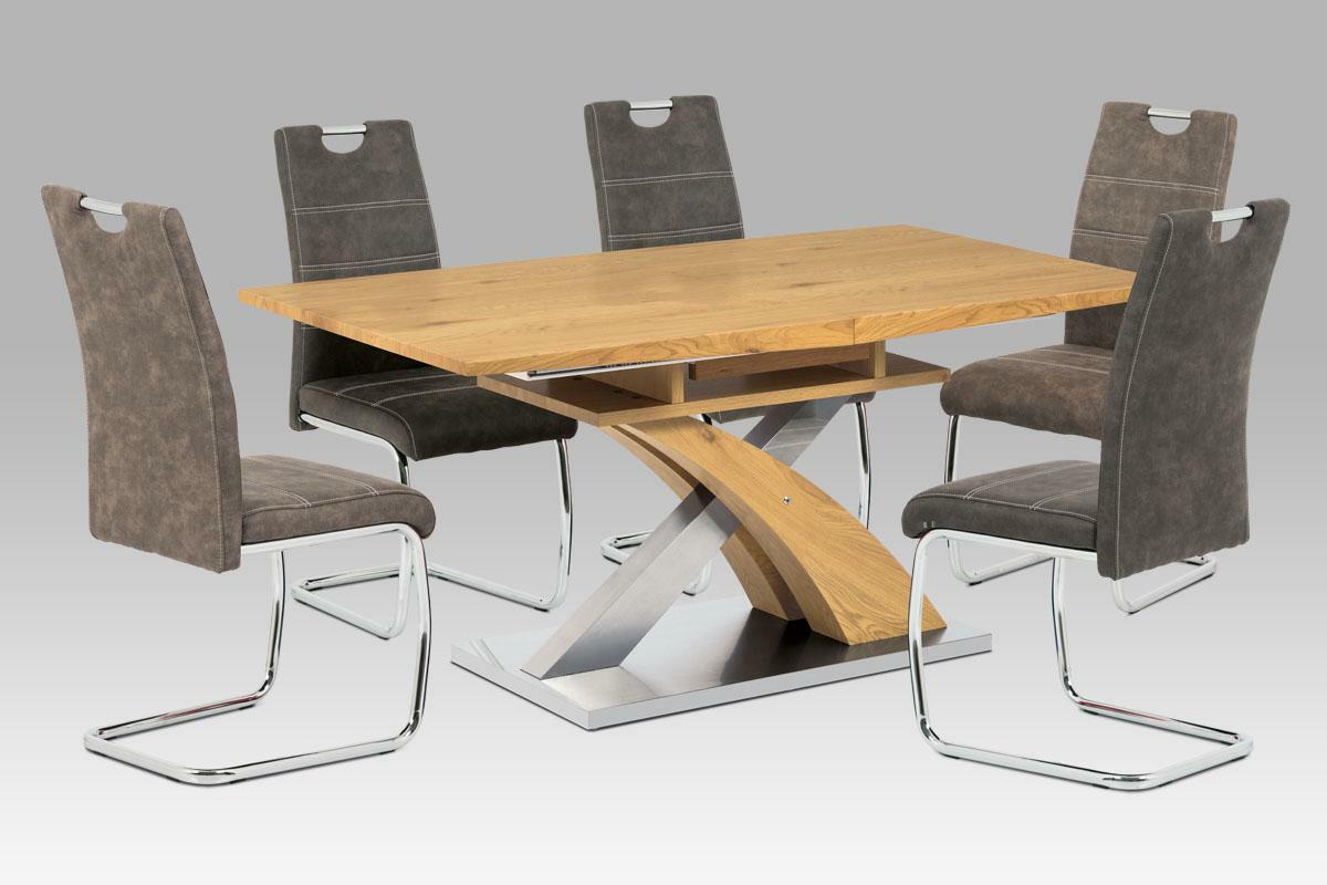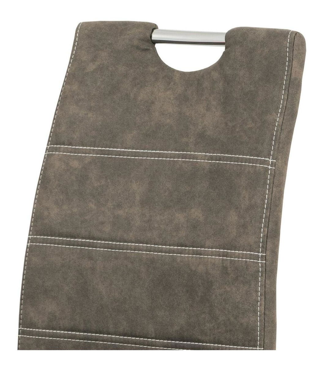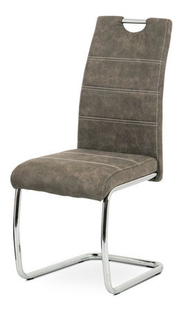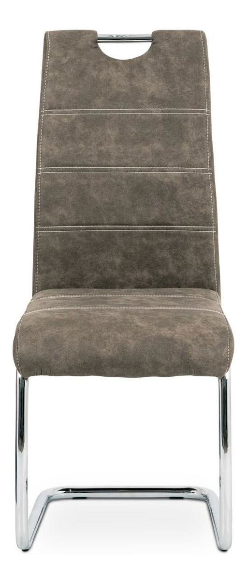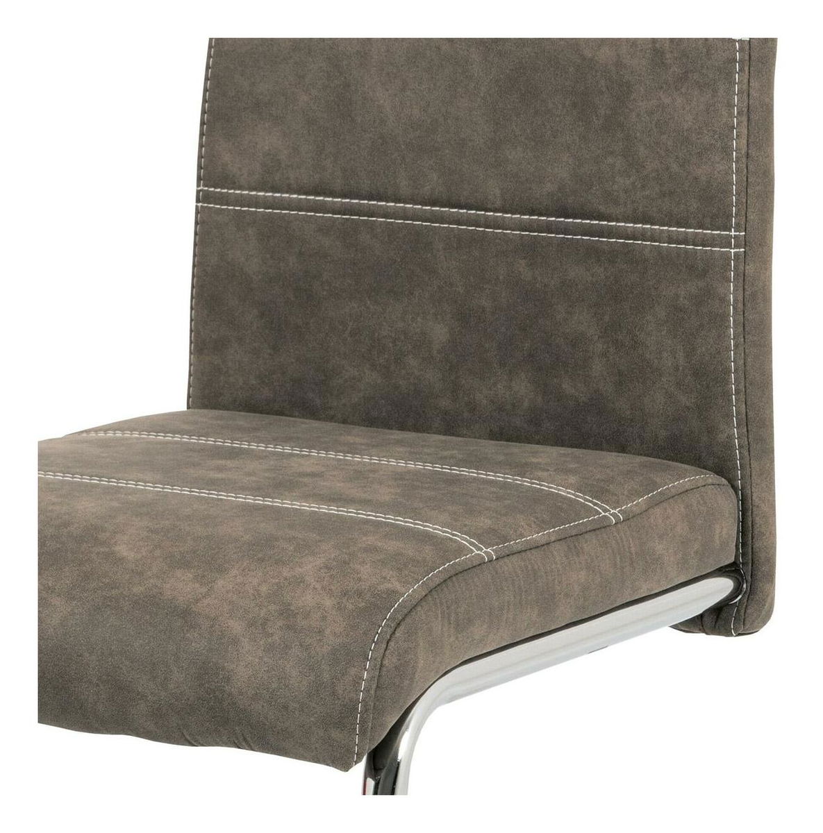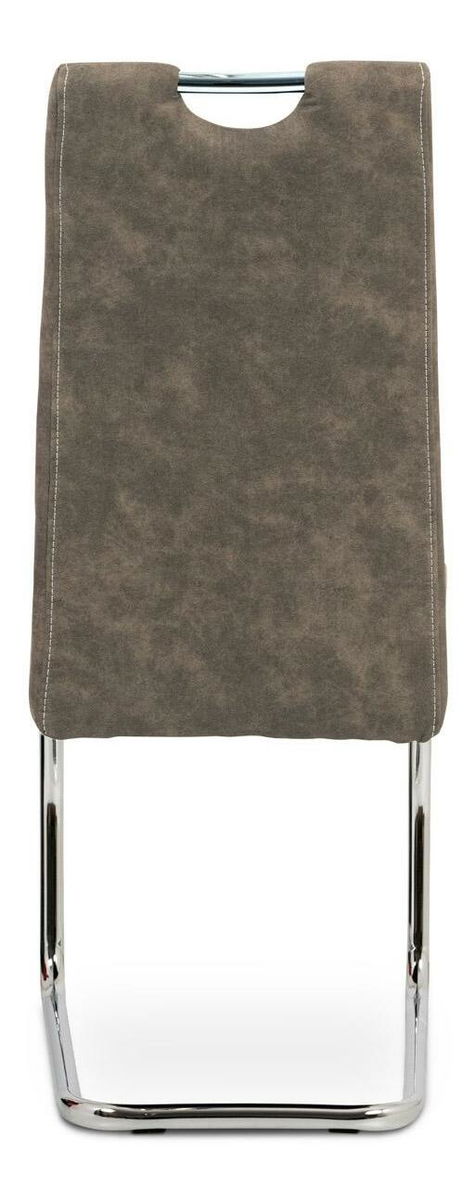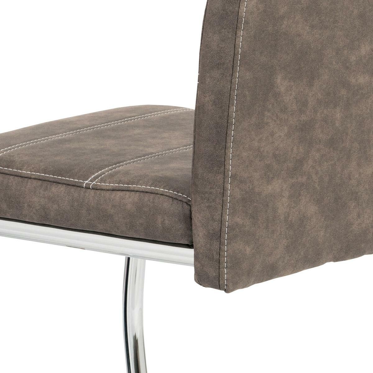 ZobrazitJídelní židle v moderním stylu. Potah hnědá látka COWBOY v dekoru vintage kůže, s bílým horizontálním prošitím sedáku a opěradla. Kovová pohupová chromovaná podnož. Nohy jsou kruhového průřezu a ukončeny plastovými kluzáky. Nosnost židle je 110 kg.
